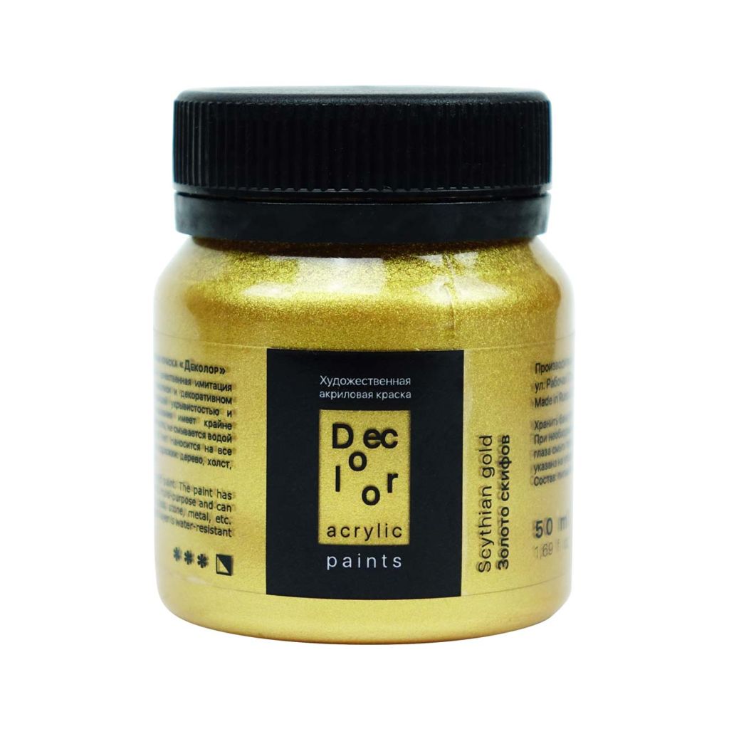 Акрил ДЕКОЛОР выпускается компанией «Таир», которая была основана в 1997 году в Санкт-Петербурге. Компания постоянно развивается и уже более 15 лет успешно работает на рынке художественных материалов. Акрил ДЕКОЛОР – смесь полиакрилатов и пигментов, вододисперсная вязкотекучая художественная краска. В серию красок ДЕКОЛОР вошли перламутровые и металлические оттенки. Краски хорошо ложатся на картон, древесину, гипс, камень, бетон и керамику. После высыхания образуют эластичную долговечную пленку, которая устойчива к воде и внешним воздействиям. Акрил ДЕКОЛОР может использоваться не только в декоративных и художественных целях, но и в реставрационных работах. Акрил ДЕКОЛОР представлен палитрой более 40 цветов, которые выпускаются поштучно в банках объемом по 50 и 100 миллилитров. Дизайн упаковки и этикетки товара может отличаться в зависимости от поставки.