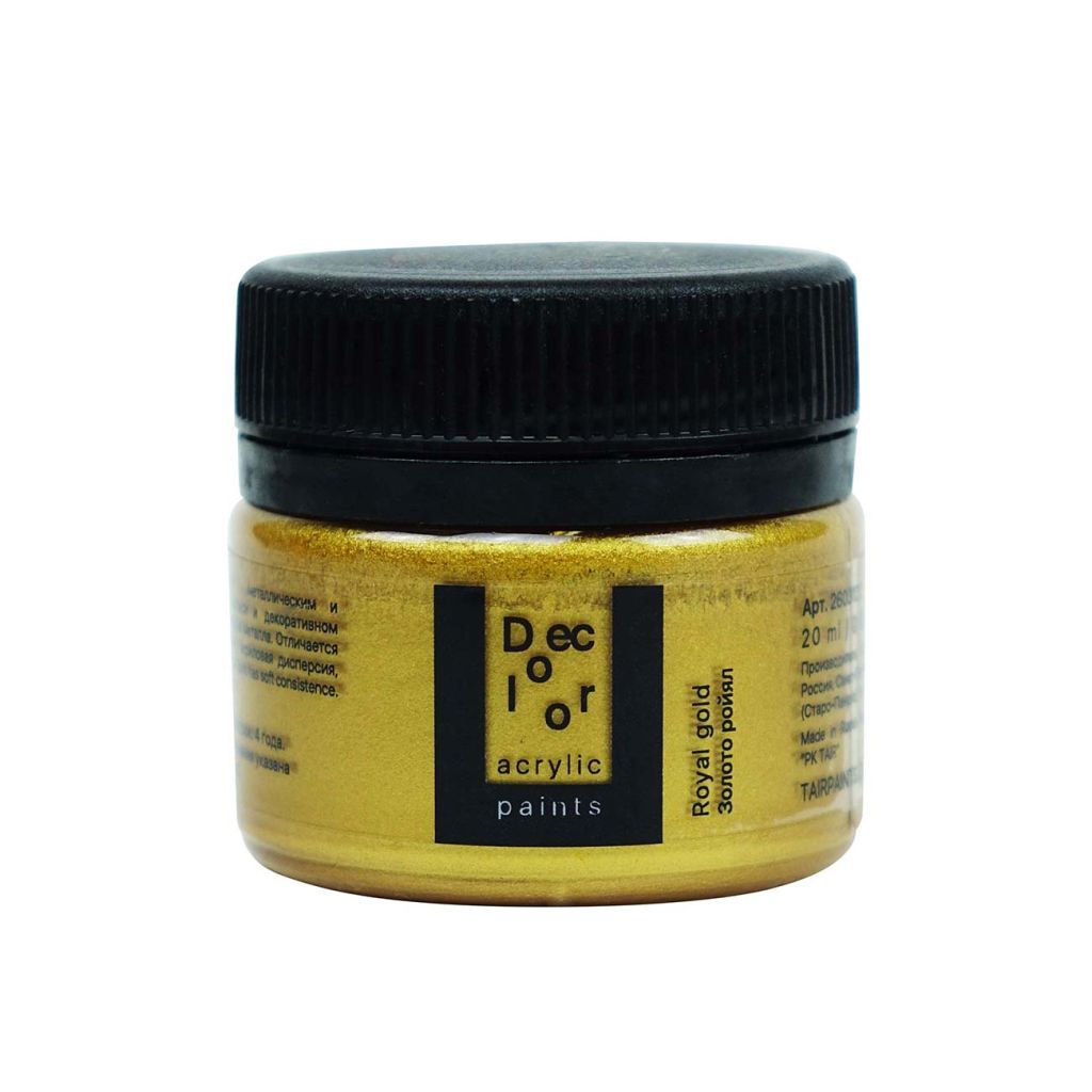 Художественные акриловые краски «Деколор» используются для имитации поверхности различных металлов. По консистенции — густые, приближенные к масляным краскам. Используются в живописных и декоративных техниках. Прекрасно подходят для объёмной живописи благодаря своим характеристикам и консистенции, а также успешно используются в техниках «сухой кисти», нанесении через трафарет, золочении элементов и т.д. Декоративные акриловые краски «Хамелеон» обладают перламутровым эффектом и прекрасно подходят для декора на любых поверхностях. Это полупрозрачная краска на акриловой основе, содержащая интерференционные пигменты. Интересный радужный эффект, который особенно заметен на тёмном фоне, можно использовать поверх нанесённого изображения в живописи, декупаже или любой другой технике. Консистенция: густая. Укрывистость: средняя. Состав: акриловая дисперсия, слюдяные пигменты, наполнитель, загуститель, консерванты, вода. Все цвета выполнены с использованием 4-5 пигментов. Свойства: ·Имеют эластичный и механически прочный красочный слой; ·Разбавляется водой, акриловым лаком, разбавителем акриловых красок и т.п.; ·После высыхания приобретает водостойкость; ·Устойчивы к атмосферному воздействию, не изменяют цвет в течение 10 лет; ·Хорошая сцепляемость с поверхностью; ·Время высыхания в течение одного часа; ·Смешиваются между собой в любых соотношениях для получения промежуточных оттенков; ·Не содержат металлов, не окисляются.
