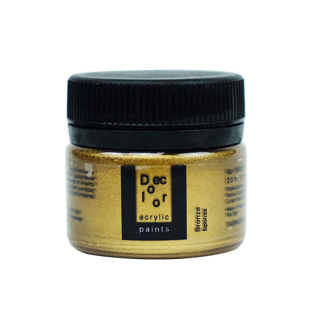 Художественные акриловые краски «Деколор» используются для имитации поверхности различных металлов. По консистенции — густые, приближенные к масляным краскам. Используются в живописных и декоративных техниках. Прекрасно подходят для объёмной живописи благодаря своим характеристикам и консистенции, а также успешно используются в техниках «сухой кисти», нанесении через трафарет, золочении элементов и т.д. Декоративные акриловые краски «Хамелеон» обладают перламутровым эффектом и прекрасно подходят для декора на любых поверхностях. Это полупрозрачная краска на акриловой основе, содержащая интерференционные пигменты. Интересный радужный эффект, который особенно заметен на тёмном фоне, можно использовать поверх нанесённого изображения в живописи, декупаже или любой другой технике. Консистенция: густая. Укрывистость: средняя. Состав: акриловая дисперсия, слюдяные пигменты, наполнитель, загуститель, консерванты, вода. Все цвета выполнены с использованием 4-5 пигментов. Свойства: ·Имеют эластичный и механически прочный красочный слой; ·Разбавляется водой, акриловым лаком, разбавителем акриловых красок и т.п.; ·После высыхания приобретает водостойкость; ·Устойчивы к атмосферному воздействию, не изменяют цвет в течение 10 лет; ·Хорошая сцепляемость с поверхностью; ·Время высыхания в течение одного часа; ·Смешиваются между собой в любых соотношениях для получения промежуточных оттенков; ·Не содержат металлов, не окисляются.