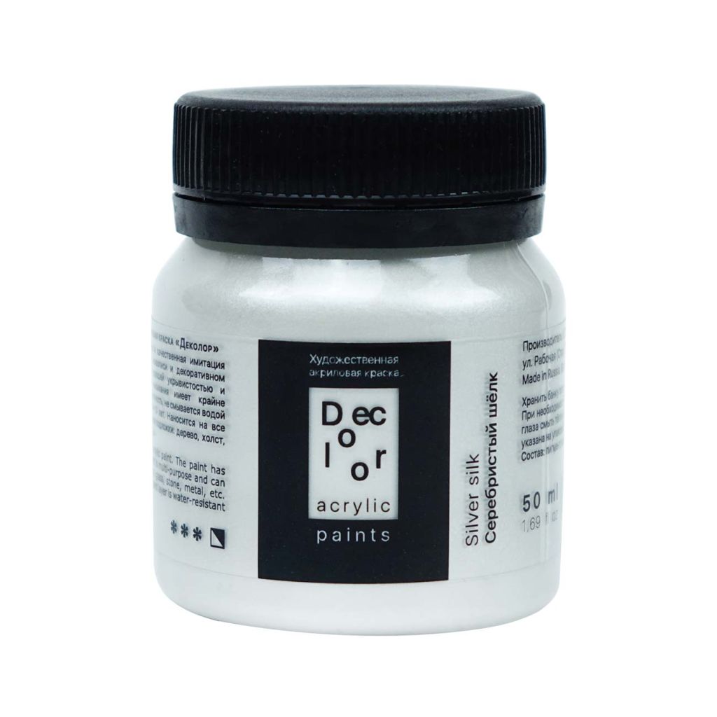 Акрил ДЕКОЛОР выпускается компанией «Таир», которая была основана в 1997 году в Санкт-Петербурге. Компания постоянно развивается и уже более 15 лет успешно работает на рынке художественных материалов. Акрил ДЕКОЛОР – смесь полиакрилатов и пигментов, вододисперсная вязкотекучая художественная краска. В серию красок ДЕКОЛОР вошли перламутровые и металлические оттенки. Краски хорошо ложатся на картон, древесину, гипс, камень, бетон и керамику. После высыхания образуют эластичную долговечную пленку, которая устойчива к воде и внешним воздействиям. Акрил ДЕКОЛОР может использоваться не только в декоративных и художественных целях, но и в реставрационных работах. Акрил ДЕКОЛОР представлен палитрой более 40 цветов, которые выпускаются поштучно в банках объемом по 50 и 100 миллилитров. Дизайн упаковки и этикетки товара может отличаться в зависимости от поставки.