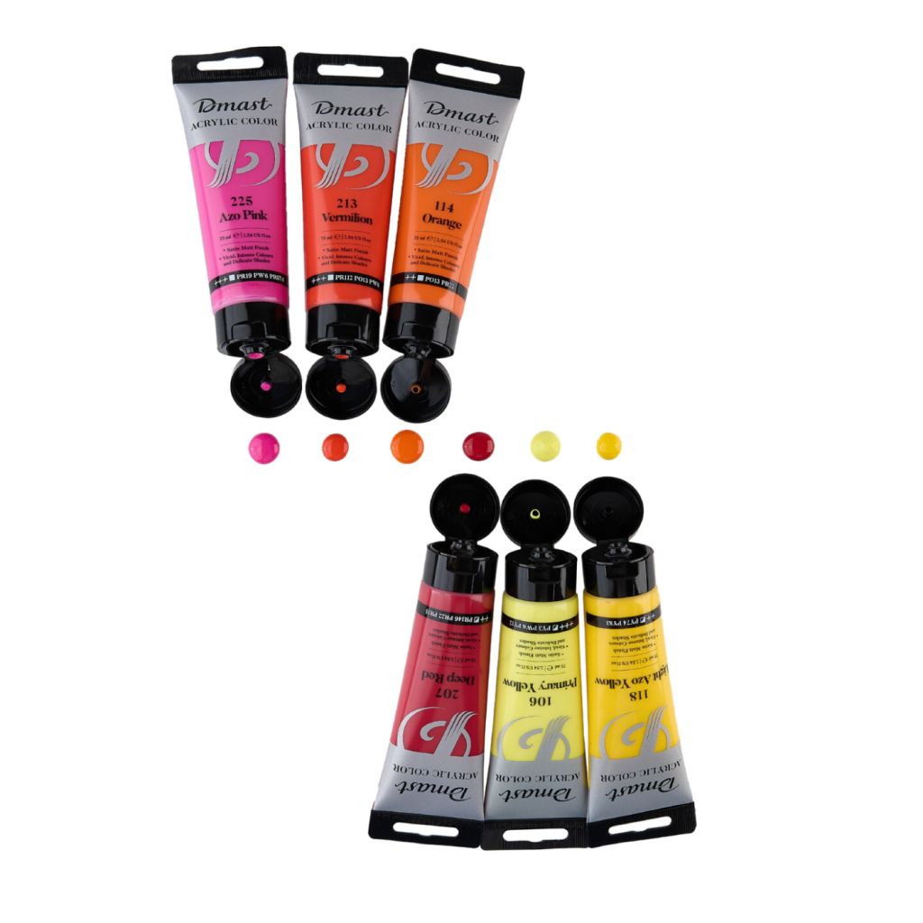 Акриловые краски Dmast предназначены для художников и декора. Атласно-матовый финиш после высыхания придаёт работам уникальный вид и тактильно приятное покрытие. Палитра представлена 14 светостойкими цветами: от пастельных до ярких оттенков. После высыхания красочный слой не трескается и не теряет объём, устойчив к воде и воздействию окружающей среды. Краски Dmast не токсичны и не имеют запаха. Акрил произведен из акрилового связующего и пигментов тонкого помола, размер частиц не превышает 0,5 микрометра, что гарантирует насыщенность и глубину цветов как в смесях, так и по отдельности. Акрил подходит для большинства типов поверхностей: бумаги, картона, тканей, пластика, камня, бетона. Предварительно следует обезжирить поверхность.