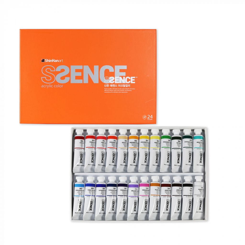 О серии: акриловые краски Shinhan Ssence произведены из высококачественных пигментов и синтетической эмульсии акриловой смолы. Краски обладают мягкой кремообразной текстурой, легко набираются кистью и ложатся на поверхность гладким слоем. Такая текстура и превосходная адгезия позволяют наносить краски на различные виды поверхностей — холст, бумага, картон, стекло, пластик, дерево и другие. Все цвета хорошо смешиваются между собой, при желании могут разбавляться водой. Серия представлена 96 цветами, краски поставляются поштучно и в наборах различной комплектации. Состав набора: №4 carmine (кармин), №10 vermilion hue (киноварь тон), №12 coral red (красный коралловый), №16 permanent orange (оранжевый устойчивый), №29 naples yellow (желтый неаполитанский), №33 permanent yellow deep (желтый насыщенный устойчивый), №35 permanent yellow light (желтый светлый устойчивый), №37 lemon yellow (желтый лимонный), №58 permanent green light (зеленый светлый устойчивый), №66 sap green (зеленый травяной (крушина)), №70 phthalocyanine green (зеленый фталоцианин), №74 bright aqua green (зеленый водный яркий), №87 cerulean blue hue (лазурно-синий церулеум тон), №93 cobalt blue hue (синий кобальт тон), №98 ultramarine deep (ультрамарин насыщенный), №100 phthalocyanine blue (синий фталоцианин), №107 permanent violet (фиолетовый устойчивый), №113 brilliant purple (пурпурный бриллиантовый), №123 medium magenta (маджента средняя), №133 yellow ochre (охра желтая), №140 burnt sienna (сиена жженая), №141 burnt umber (умбра жженая), №162 black (черный), №170 titanium white (белила титановые). Применение: для художественных работ в различных техниках, в том числе подходят для заливок и техники флюид-арт. Производство: компания из Южной Кореи ShinHan Art International Inc славится своей продукцией, предназначенной для иллюстраторов, аниматоров, дизайнеров и архитекторов. Компания была основана в 1967 году и на тот момент называлась Haneel. Сегодня ShinHan Art International Inc славится во всем мире превосходным качеством своей продукции. Особенностью данной марки является внимание к деталям и дизайну. Применение современных технологий и следование традициям производства, позволяют создавать эргономичные, удобные и сверхнадежные канцелярские принадлежности. Продукция компании используются в различных сферах и популярна среди профессиональных художников, а также любителей творчества и хобби.