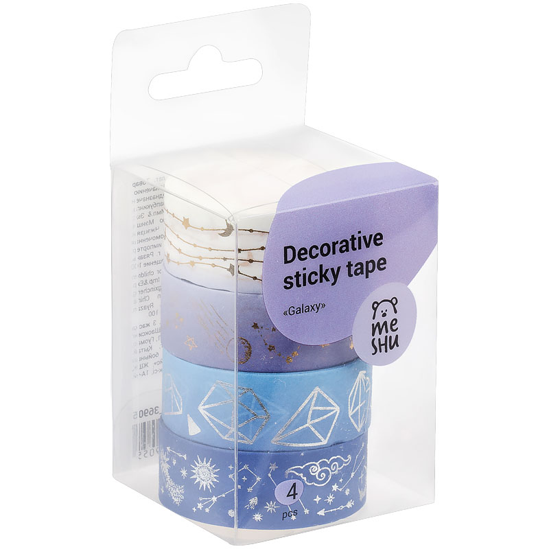 Декоративные клейкие ленты MESHU предназначены для упаковки подарков, оформления поделок, элементов интерьера и скрапбукинга. Открытки, альбомы, ежедневники, подставки, цветочные горшки, подсвечники, рамки и много другое может преобразиться с декоративными лентами MESHU. Яркие и современные дизайны сделают процесс творчества увлекательным, а результат впечатляющим. А качественная клеевая основа позволит надежно зафиксировать ленту и быть уверенным в долговечности декора.