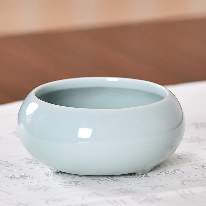 Чаша изготовлена из фарфора и покрыта селадоном, особым типом глазури, изобретённом в древнем Китае, в провинции Чжэцзян. Такая чаша может использоваться для воды или туши, благодаря глазури, она не впитывает пигменты и красители и легко отмывается. Размеры чаши: высота 4.3 см., внешний диаметр 9.5 см., внутренний диаметр 7.5 см.