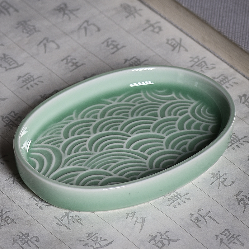 Блюдечко овальной формы выполнено из фарфора и покрыто глазурью. Блюдечко легко моется, не впитывает пигменты и красители отлично подойдет для работы тушью, может использоваться в работе с красками. Длина 12.3 см, ширина 8.6, высота 2 см.