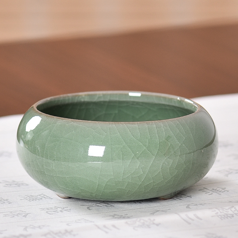 Чаша изготовлена из фарфора и покрыта селадоном, особым типом глазури, изобретённом в древнем Китае, в провинции Чжэцзян. Такая чаша может использоваться для воды или туши, благодаря глазури, она не впитывает пигменты и красители и легко отмывается. Размеры чаши: высота 4.3 см., внешний диаметр 9.5 см., внутренний диаметр 7.5 см.