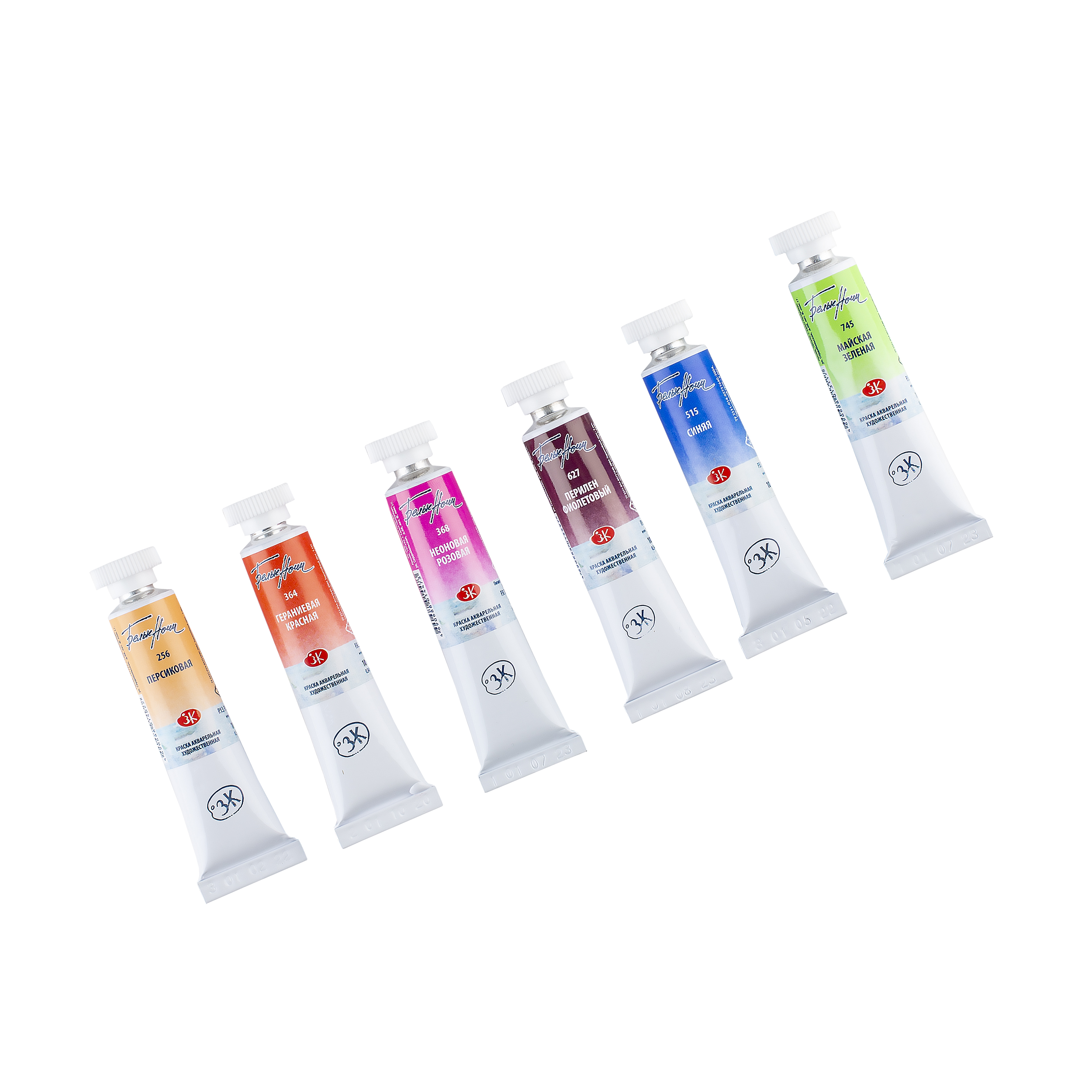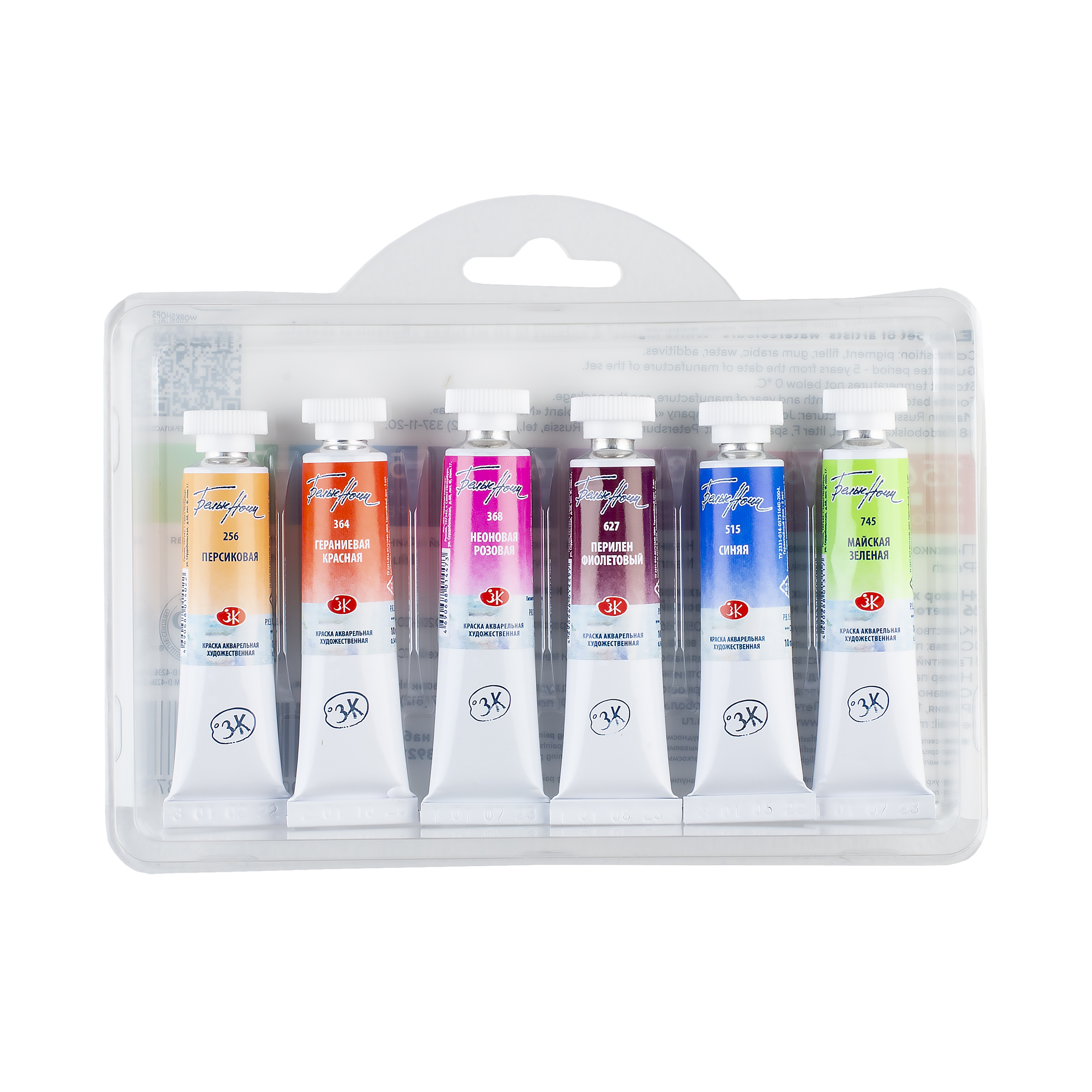 Акварель «Белые ночи» — визитная карточка завода «Невская палитра», эти краски признаны профессиональными художниками и считаются одними из лучших среди отечественных акварелей. Художественные акварельные краски «Белые ночи» изготавливаются из тонкотертых пигментов и связующего из натурального гуммиарабика, признанного лучшим растительным клеем для приготовления художественных водных красок. Максимальная интенсивность цветового тона акварели, сохраняющаяся даже при разбавлении большим количеством воды, достигается благодаря высокой концентрации пигмента и тонкости его перетира. Такие свойства, как яркость и чистота цвета, высокая светостойкость, прекрасная разносимость и прозрачность сделали акварель ЗХК любимыми красками нескольких поколений живописцев. В наборе 6 туб по 10 мл. в сбалансированной цветовой палитре: персиковая, гераниевая красная, неоновая розовая, перилен фиолетовый, синяя, майская зелёная.