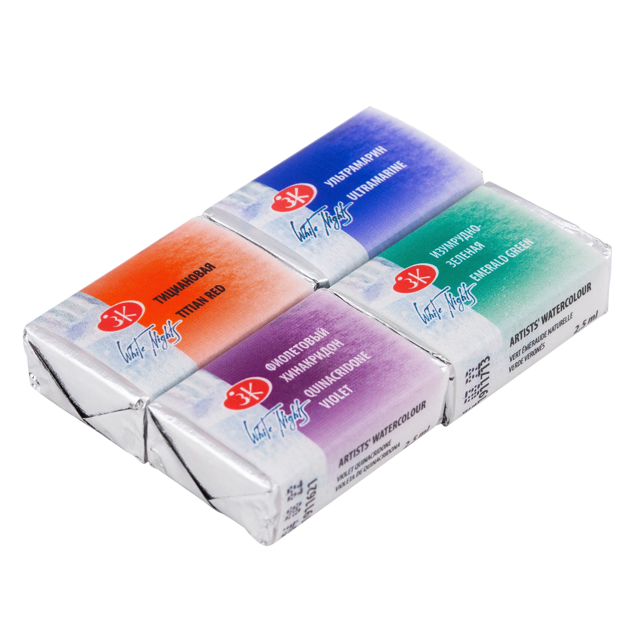 Акварель «Белые ночи» — визитная карточка завода «Невская палитра», эти краски признаны профессиональными художниками и считаются одними из лучших среди отечественных акварелей. Художественные акварельные краски «Белые ночи» изготавливаются из тонкотертых пигментов и связующего из натурального гуммиарабика, признанного лучшим растительным клеем для приготовления художественных водных красок. Максимальная интенсивность цветового тона акварели, сохраняющаяся даже при разбавлении большим количеством воды, достигается благодаря высокой концентрации пигмента и тонкости его перетира. Такие свойства, как яркость и чистота цвета, высокая светостойкость, прекрасная разносимость и прозрачность сделали акварель ЗХК любимыми красками нескольких поколений живописцев. Цвета в наборе: тициановая, ультрамарин, фиолетовый хинакридон, изумрудно-зеленая.