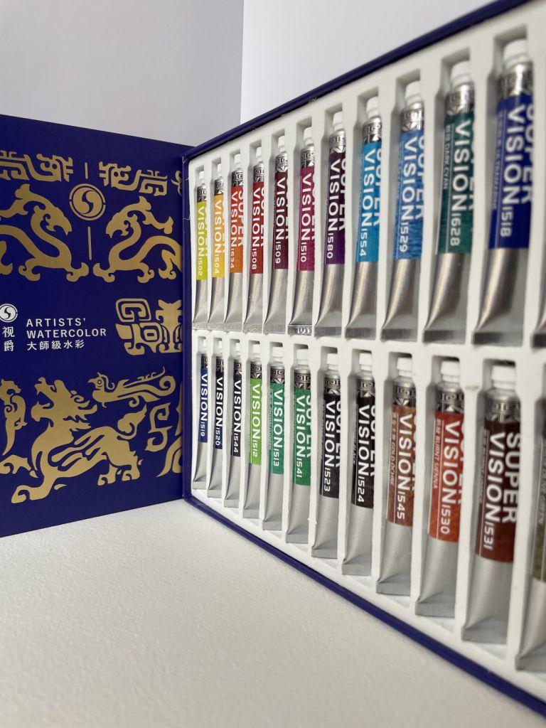 Наборы акварели Super Vision серии Master включают в себя широкую палитру монопигментных цветов, которые отвечают потребностям художников любого уровня. В наборах представлены как основные базовые оттенки с высокой укрывистотью, так и изысканные текучие полупрозрачные тона. Большая часть цветов в наборе имеет монопигментный состав, что обеспечивает исключительную чистоту цвета и отличную смешиваемость «без грязи». Высокое содержание пигментов мелкого помола гарантируют богатство и насыщенность каждого цвета. Все акварели прошли строгие испытания на светочувствительность, ваши работы надолго сохранят первозданный вид, что особенно важно для профессиональных работ. Превосходная текучесть обеспечивает широкий спектр применения акварели в самых разных акварельных техниках. Серия представлена наборами с 24 и 48 цветами.