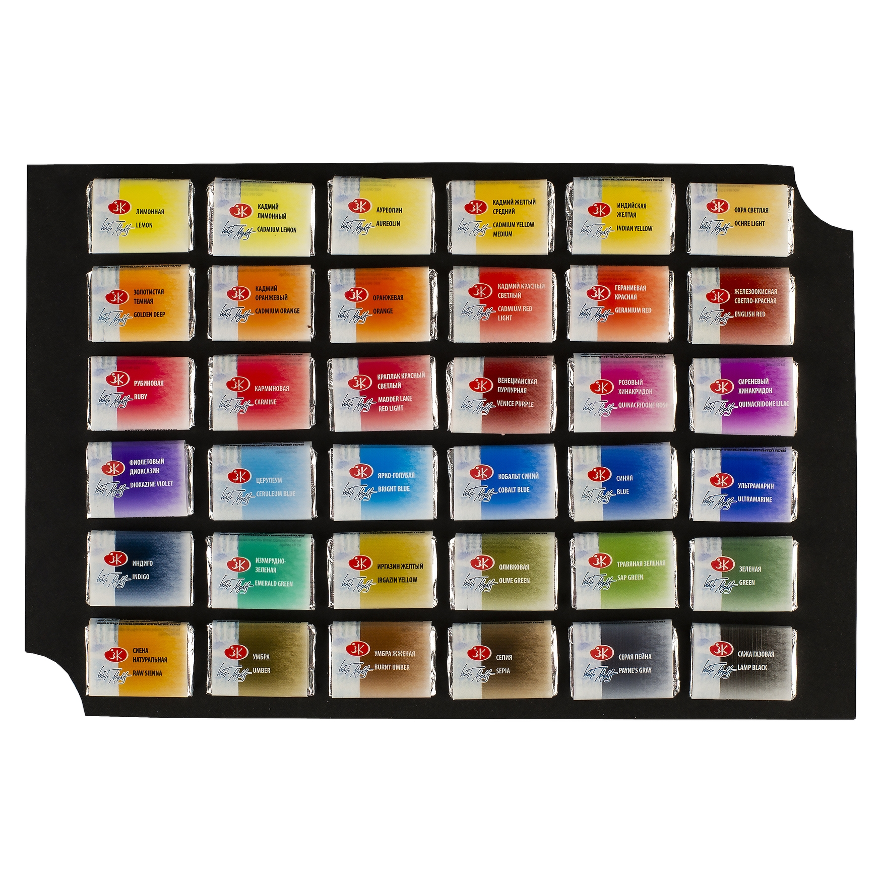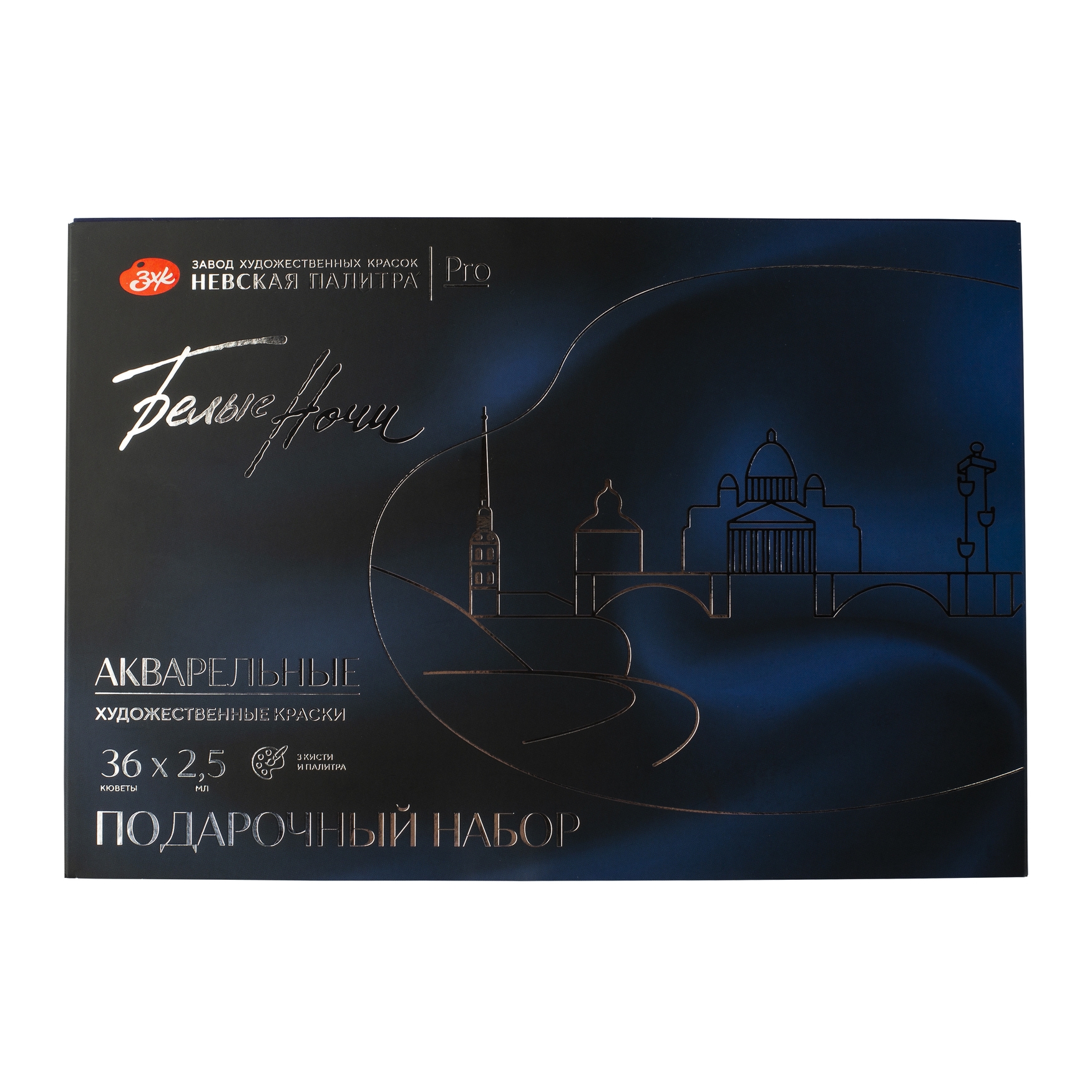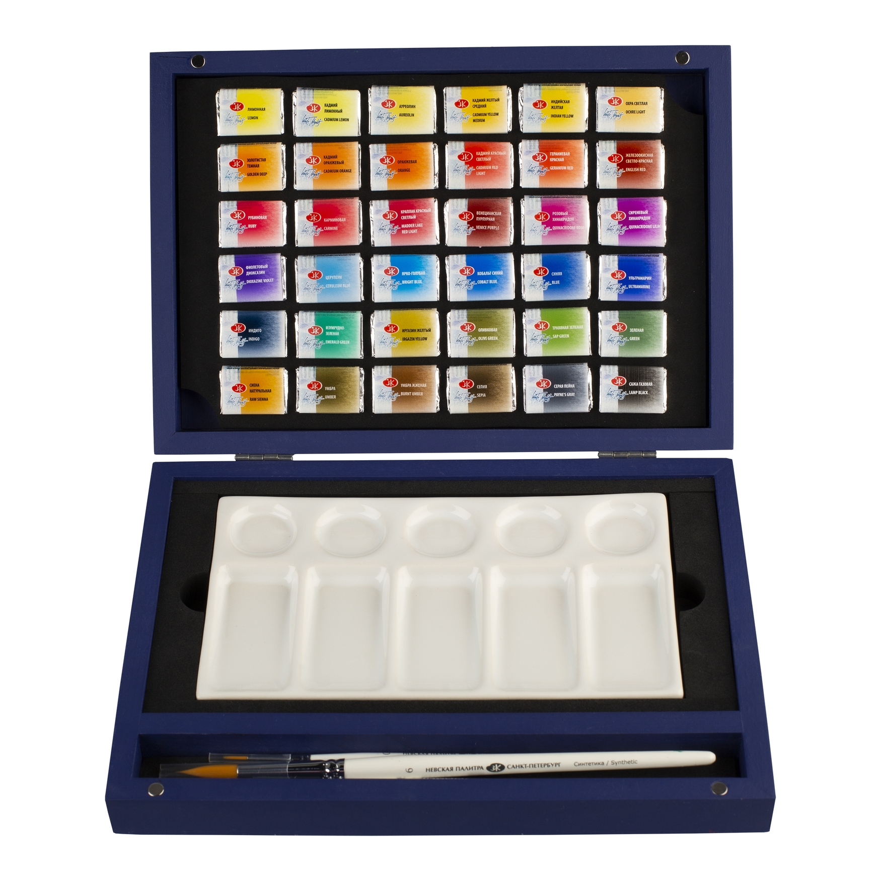 Акварель «Белые ночи» — визитная карточка завода «Невская палитра», эти краски признаны профессиональными художниками и считаются одними из лучших среди отечественных акварелей. Художественные акварельные краски «Белые ночи» изготавливаются из тонкотертых пигментов и связующего из натурального гуммиарабика, признанного лучшим растительным клеем для приготовления художественных водных красок. Максимальная интенсивность цветового тона акварели, сохраняющаяся даже при разбавлении большим количеством воды, достигается благодаря высокой концентрации пигмента и тонкости его перетира. Такие свойства, как яркость и чистота цвета, высокая светостойкость, прекрасная разносимость и прозрачность сделали акварель ЗХК любимыми красками нескольких поколений живописцев. Сбалансированная палитра набора акварели «Белые ночи» состоит из 36 цветов и позволяет решить множество творческих задач художника-акварелиста. Корпус пенала с ярко-синей тонировкой выполнен из качественной натуральной березы. Кюветы надежно располагаются в съемном ложементе. Пенал оснащен магнитным замком. В комплектацию набора входят: кисть синтетика, круглая короткая ручка «Невская палитра» №6 (6 мм), кисть синтетика, круглая короткая ручка «Невская палитра» №0 (1,2 мм), кисть белка, круглая короткая ручка «Невская палитра» №3, фарфоровая палитра, 36 кювет акварели.