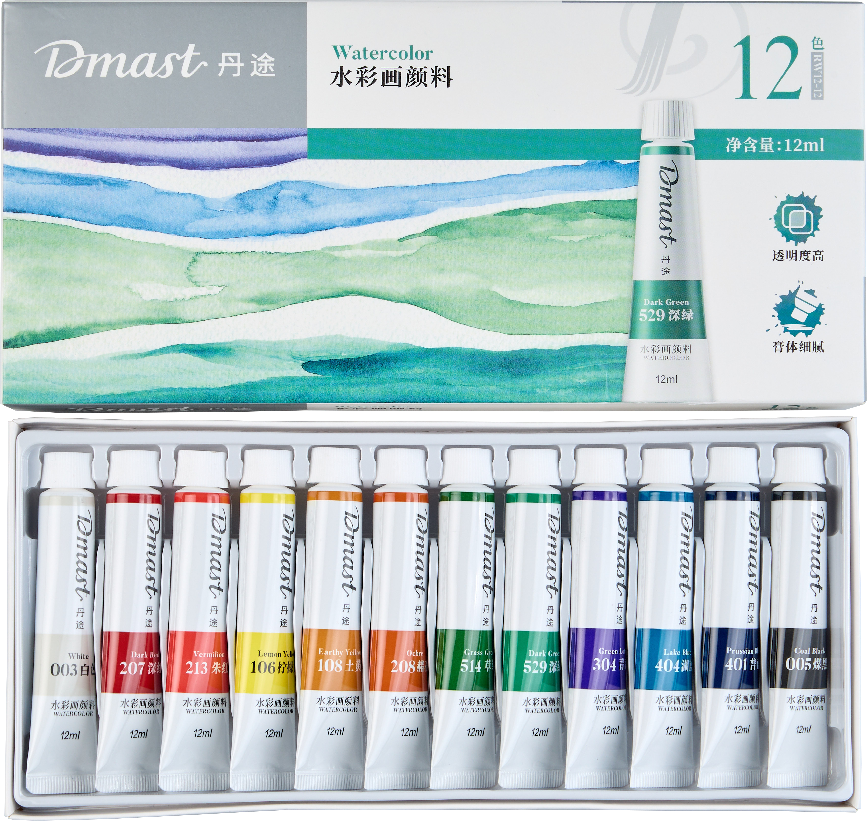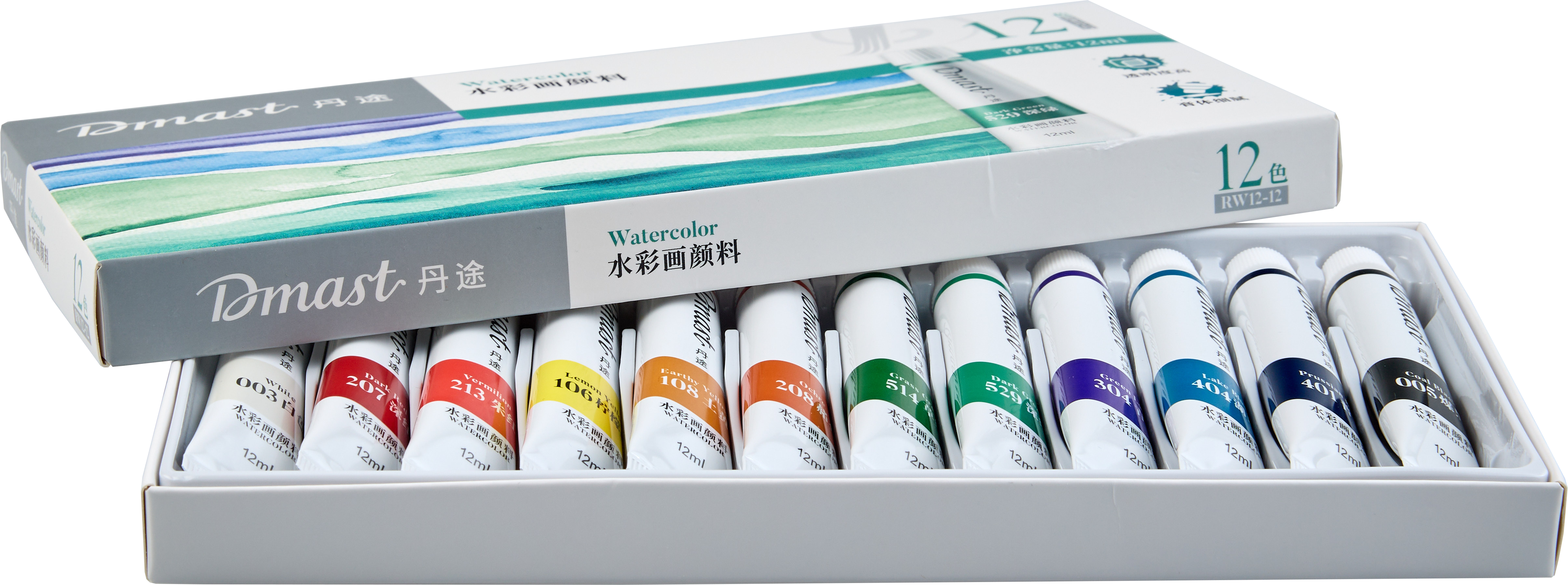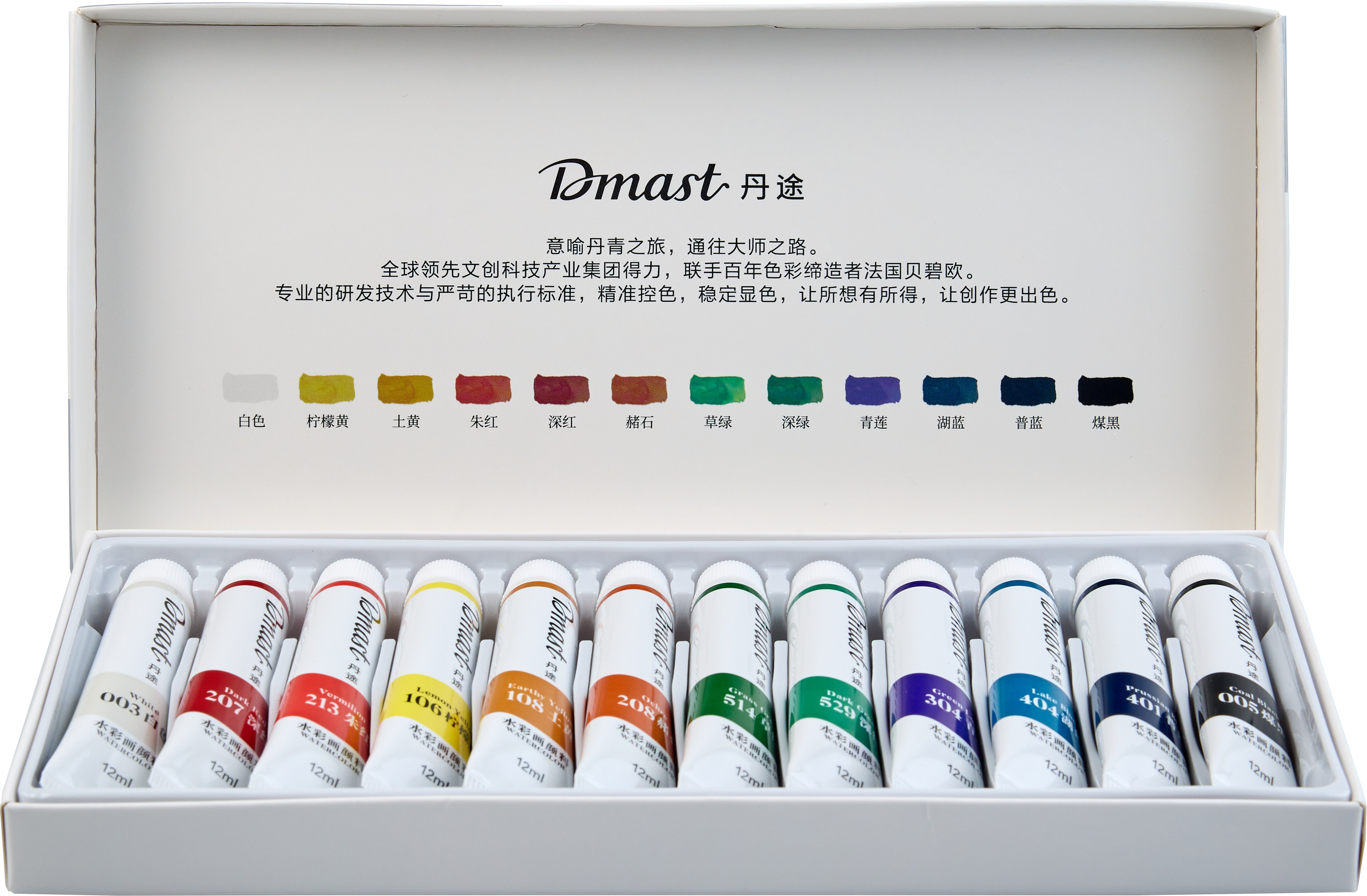 Акварель Dmast произведена из натурального гуммиарабика и пигментов тончайшего помола — размер частиц менее 1 микрона. Краски Dmast имеют чистые прозрачные цвета и высокую светостойкость. Каждая партия проходит экспертизу в лаборатории цвета на соответствие эталону. Упаковка набора произведена из прочного картона с покрытием Soft-touch. Внутри упаковки пластиковые подложки для раздельного хранения туб и легкого доступа к ним. Тубы произведены из плотного пластика с удобной крышкой. Продукция бренда Dmast создана благодаря сочетанию высокого качества выверенных технологий бренда Pebeо и инновационным производственным процессам компании Deli — крупнейшего производителя канцелярских товаров в Азии.