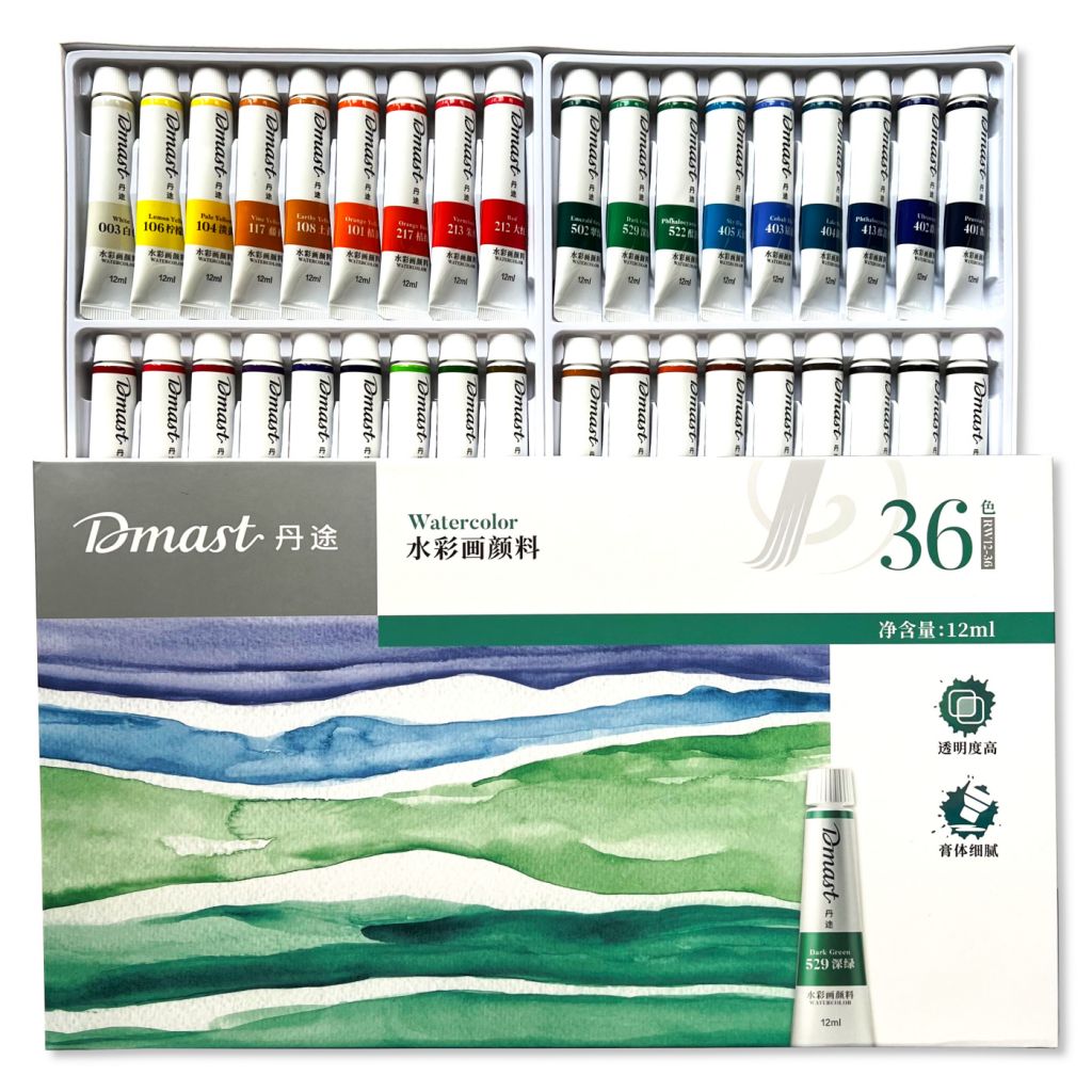 Акварель Dmast произведена из натурального гуммиарабика и пигментов тончайшего помола — размер частиц менее 1 микрона. Краски Dmast имеют чистые прозрачные цвета и высокую светостойкость. Каждая партия проходит экспертизу в лаборатории цвета на соответствие эталону. Упаковка набора произведена из прочного картона с покрытием Soft-touch. Внутри упаковки пластиковые подложки для раздельного хранения туб и легкого доступа к ним. Тубы произведены из плотного пластика с удобной крышкой. Продукция бренда Dmast создана благодаря сочетанию высокого качества выверенных технологий бренда Pebeо и инновационным производственным процессам компании Deli — крупнейшего производителя канцелярских товаров в Азии.