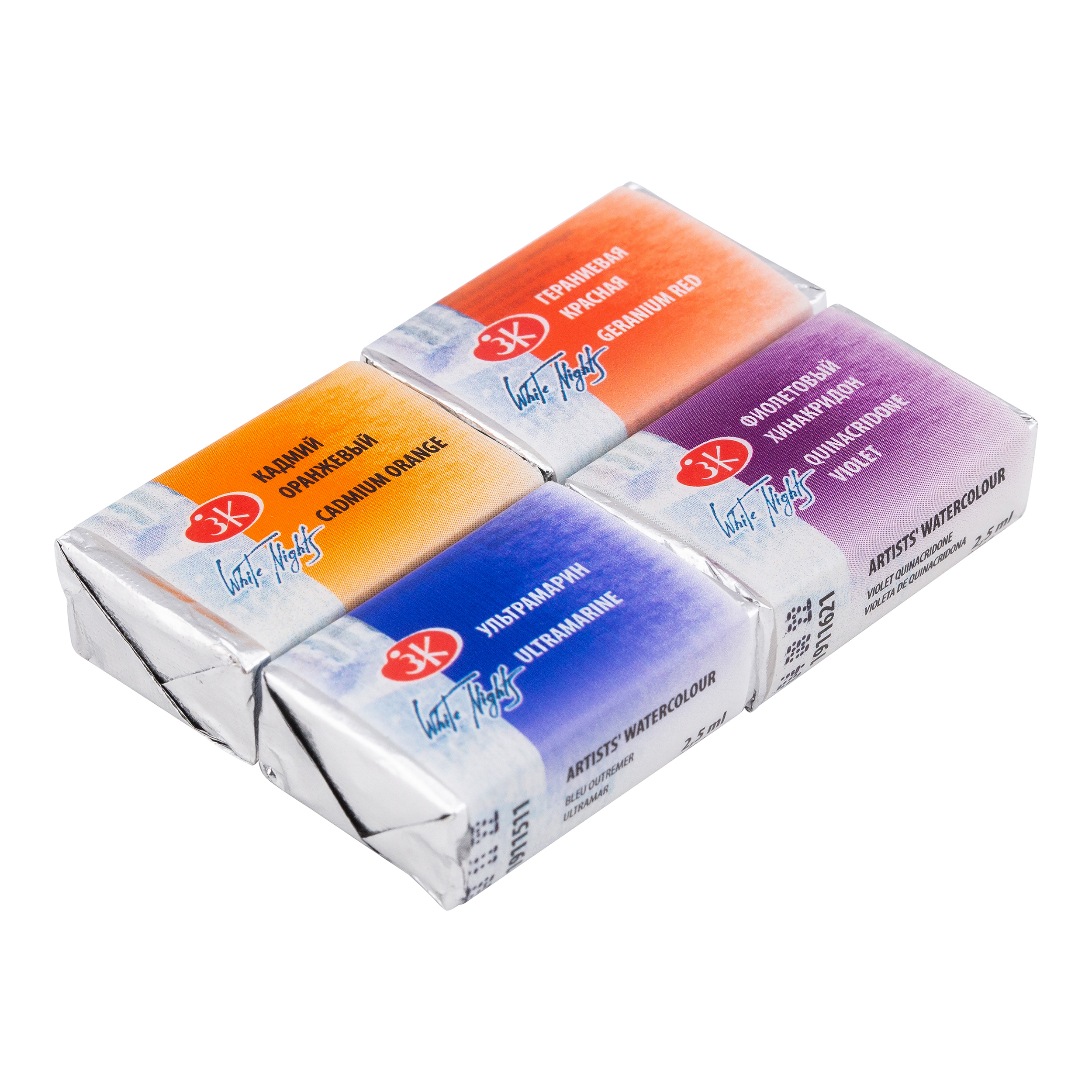 Акварель «Белые ночи» — визитная карточка завода «Невская палитра», эти краски признаны профессиональными художниками и считаются одними из лучших среди отечественных акварелей. Художественные акварельные краски «Белые ночи» изготавливаются из тонкотертых пигментов и связующего из натурального гуммиарабика, признанного лучшим растительным клеем для приготовления художественных водных красок. Максимальная интенсивность цветового тона акварели, сохраняющаяся даже при разбавлении большим количеством воды, достигается благодаря высокой концентрации пигмента и тонкости его перетира. Такие свойства, как яркость и чистота цвета, высокая светостойкость, прекрасная разносимость и прозрачность сделали акварель ЗХК любимыми красками нескольких поколений живописцев. Цвета в наборе: кадмий оранжевый, гераниевая красная, ультрамарин, фиолетовый хинакридон.