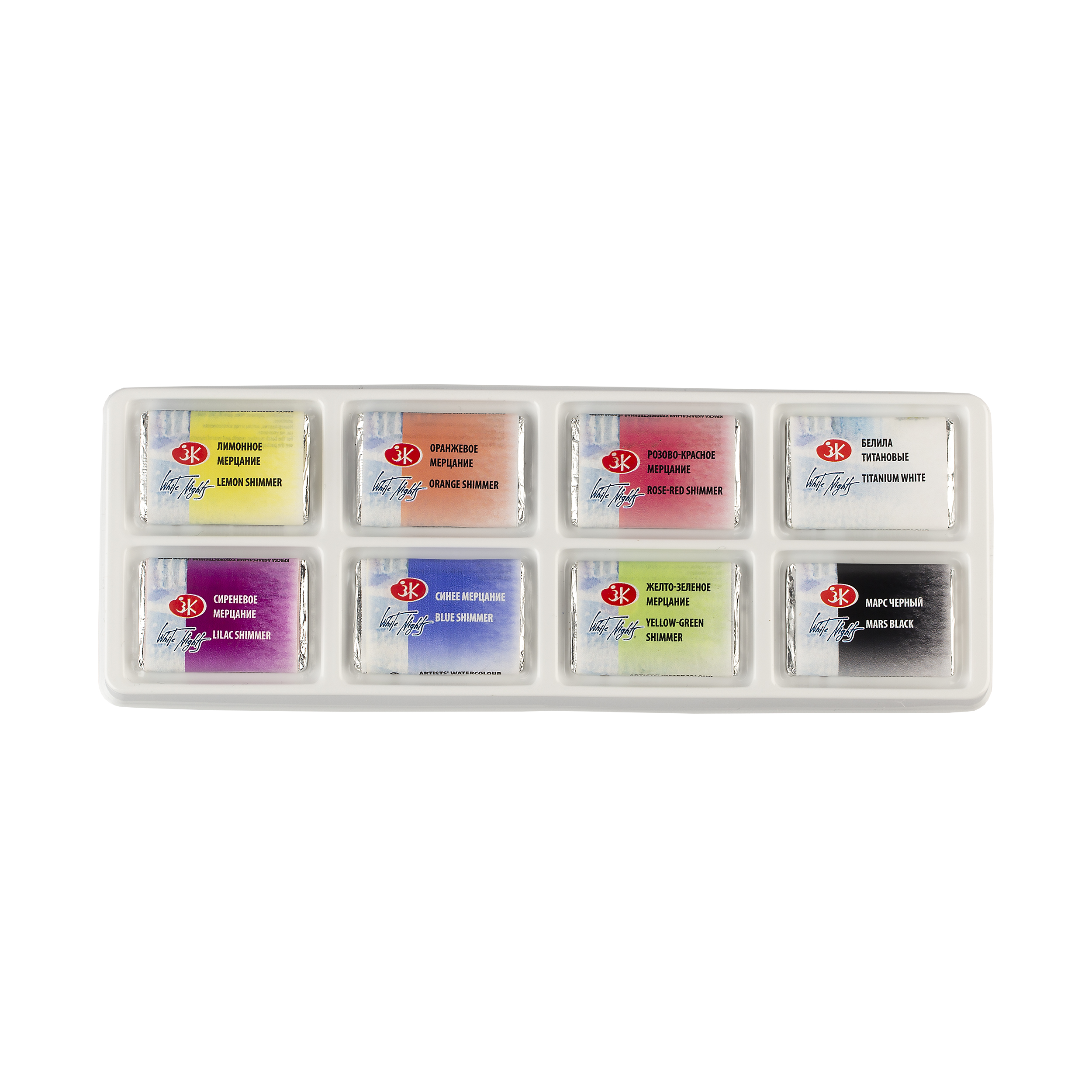 Мерцающие акварели – уникальная разработка ЗХК «Невская палитра», в которой сочетаются традиционная красота художественной акварели «Белые ночи» и инновационные технологии в области создания мерцающих пигментов. Цветовая гамма набора состоит из 6 ярких оттенков мерцающих акварелей серии «Мерцание», дополненных белым и черным оттенками основной палитры акварели «Белые Ночи». Серия акварели «Мерцание» — хамелеоны и дуохромы в акварели, обладает насыщенным блеском и переливом цвета в работе на черной бумаге и ярким основным тоном цвета с крупным зерном мерцания в работе на белых сортах бумаги. Мерцающая акварель прекрасно набирается из кюветы на кисть, позволяет работать пером в графической технике и технике каллиграфии. Шесть ярких оттенков серии «Мерцание» имеют единое крупное зерно мерцающих частиц. Профессиональные художественные акварельные краски «Белые ночи» представляют собой тонкодисперсные суспензии пигментов и наполнителей в связующем. В состав связующего входит водный раствор растительного клея – натурального гуммиарабика.