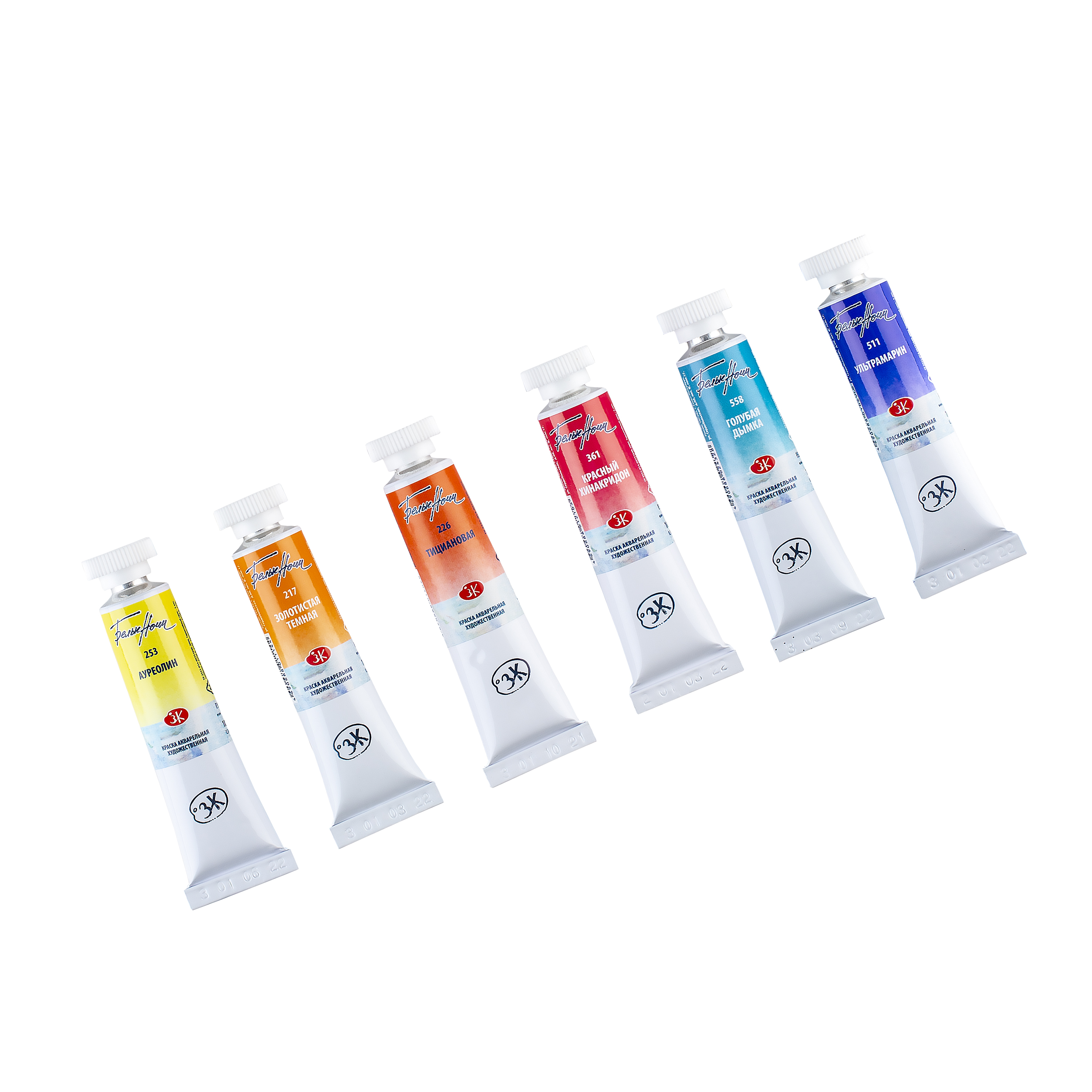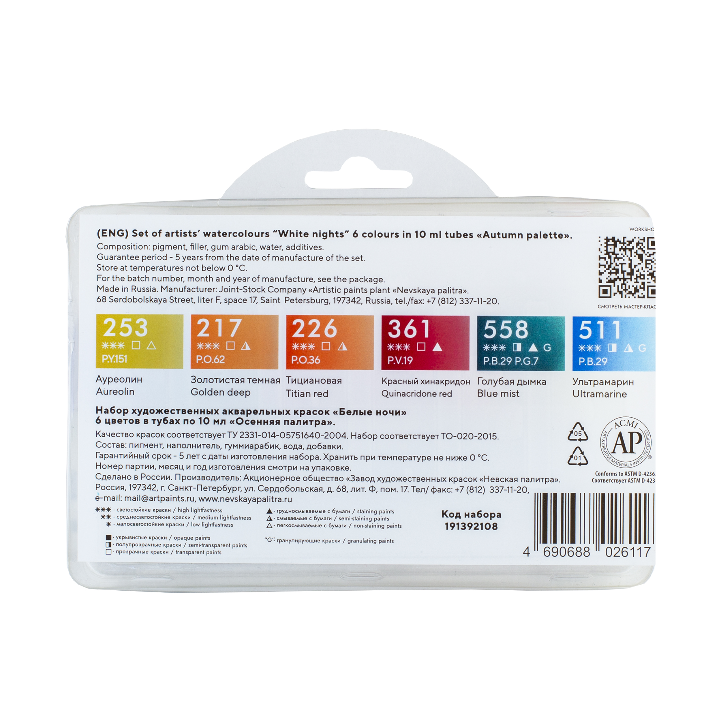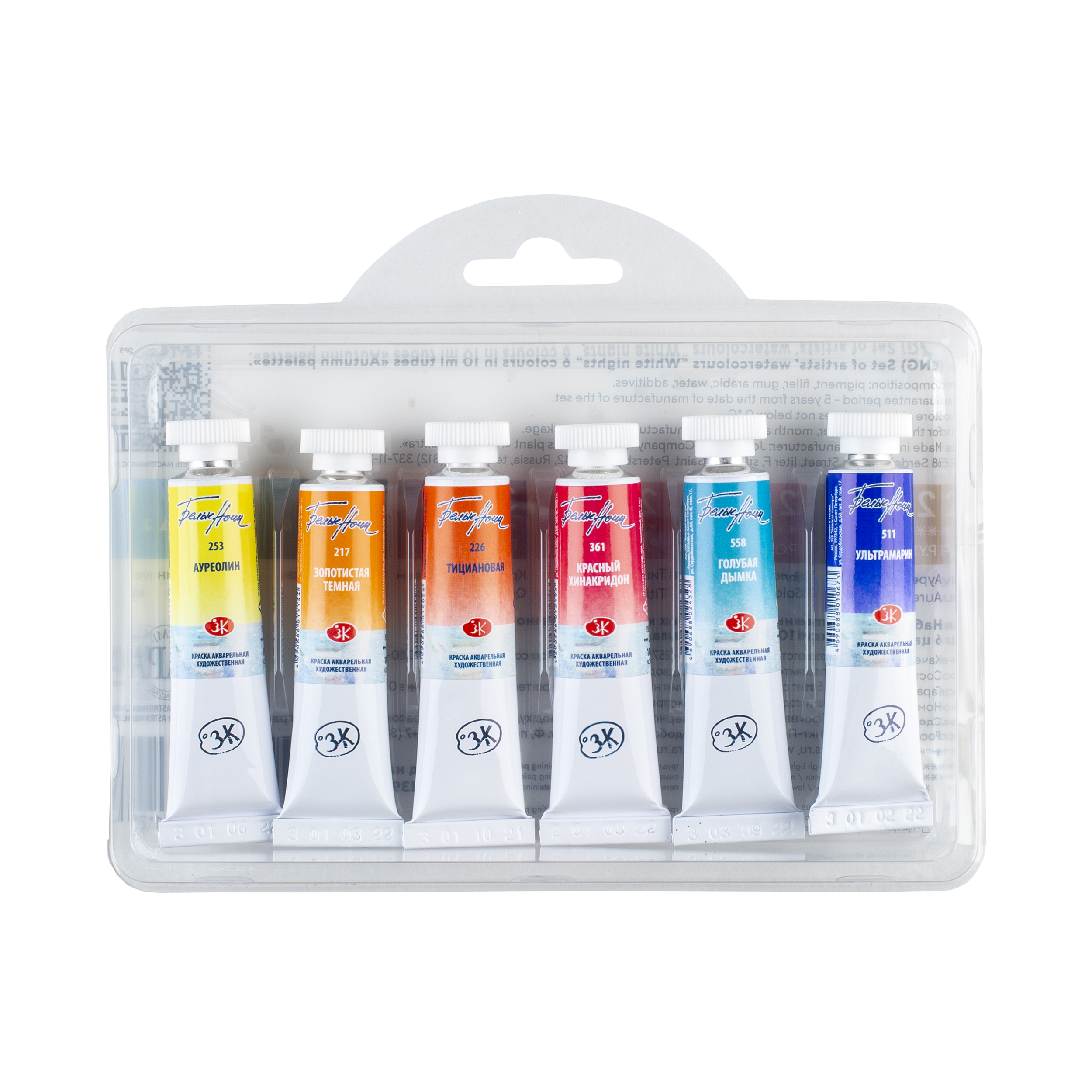 Акварель «Белые ночи» — визитная карточка завода «Невская палитра», эти краски признаны профессиональными художниками и считаются одними из лучших среди отечественных акварелей. Художественные акварельные краски «Белые ночи» изготавливаются из тонкотертых пигментов и связующего из натурального гуммиарабика, признанного лучшим растительным клеем для приготовления художественных водных красок. Максимальная интенсивность цветового тона акварели, сохраняющаяся даже при разбавлении большим количеством воды, достигается благодаря высокой концентрации пигмента и тонкости его перетира. Такие свойства, как яркость и чистота цвета, высокая светостойкость, прекрасная разносимость и прозрачность сделали акварель ЗХК любимыми красками нескольких поколений живописцев. В наборе 6 туб по 10 мл. в сбалансированной цветовой палитре: ауреолин, золотистая темная, тициановая, красный хинакридон, голубая дымка, ультрамарин.