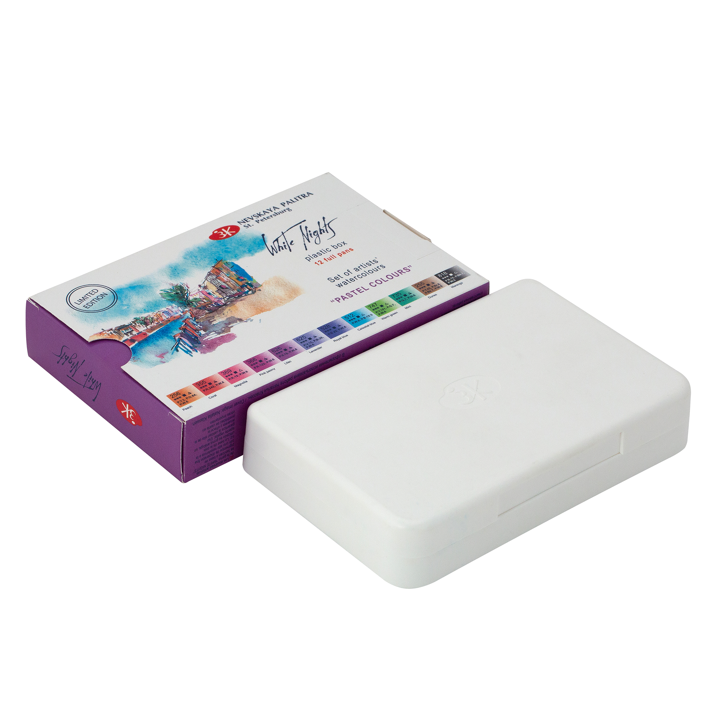 Акварель «Белые ночи» — краски, выпускаемые в полусухом виде в кюветах по 1,6 миллилитров и в тубах по 10 мл. Акварель «Белые ночи» изготовлена из высококачественных тонко тертых пигментов и связующего с добавлением гуммиарабика. Цвета хорошо смешиваются между собой и легко размываются водой. Краска обладает высокой светостойкостью. Акварелью в кюветах можно заменить закончившиеся краски из набора, что очень удобно. Все акварельные краски в палитре «Белые ночи» безопасны, сертифицированы и соответствуют стандартам ASTM D-4236. Высокая концентрация пигмента обеспечивают максимальную интенсивность цветового тона акварели. Насыщенность сохраняется даже при разбавлении большим количеством воды. Отличаются прозрачностью, что дает возможность художнику работать тонкими лессировками. Чистые цвета позволяют писать в смесях и получать богатое многообразие оттенков. Основная часть красок обладает высочайшим показателем светостойкости, что способствует сохранности работ свыше 100 лет. Все это обеспечивает их высокое качество и возможность использования в ответственных работах. Акварель «Белые ночи» производится заводом художественных красок Невская палитра, расположенным в городе Санкт-Петербурге. Завод уже более 80 лет выпускает продукцию для профессиональных художников и любителей творчества.