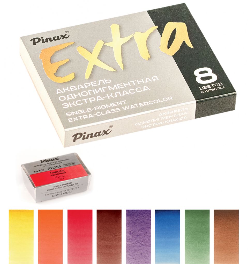 Профессиональная акварель Pinax EXTRA характеризуется применением лучших пигментов и натурального высококачественного гуммиарабика. Высокая степень перетира на краскотерках с керамическими валами, а также максимальная концентрация пигмента позволяют получать цвета с непревзойденной прозрачностью, чистотой и насыщенностью цвета. Краски прекрасно смешиваются и идеально подходят для всех акварельных техник. Только цвета, сделанные на основе пигментов с максимальной светостойкостью, могут войти в серию EXTRA. В этой линейке акварельных красок Pinax намерено решили отказаться от маркетинговых названий цветов, использовав взамен имя пигмента, сосредоточив фокус на том что действительно важно. Это нашло продолжение в дизайне этикетки – цветовой индекс пигмента расположен по центру этикетки. Для достижения максимальной прозрачности и чистоты цвета при производстве акварели серии Pinax EXTRA значимы следующие факторы: краски перетираются на краскотерках с керамическими валами, чтобы добиться абсолютной чистоты цвета и оптимальной дисперсии пигментов; в отличие от металлических валов, используемых при производстве красок большинством производителей, керамические валы не дают металлического загрязнения краски и практически не нагреваются при трении, что позволяет получать при заводском производстве краску лабораторного уровня качества; акварель производится в России на новейшем оборудовании, используя современные методы производства; в производстве применяются только чистейшие пигменты высшего качества от лучших мировых производителей со всего мира; контроль качества сырья и на каждом этапе производства. Цвета в наборе: никель азометин, пиррол оранжевый, пиррол красный, кадмий пурпурно-красный, кобальт фиолетовый тёмный, синяя ФЦ, оксид хрома зелёный, оксид железа красно-коричневый.