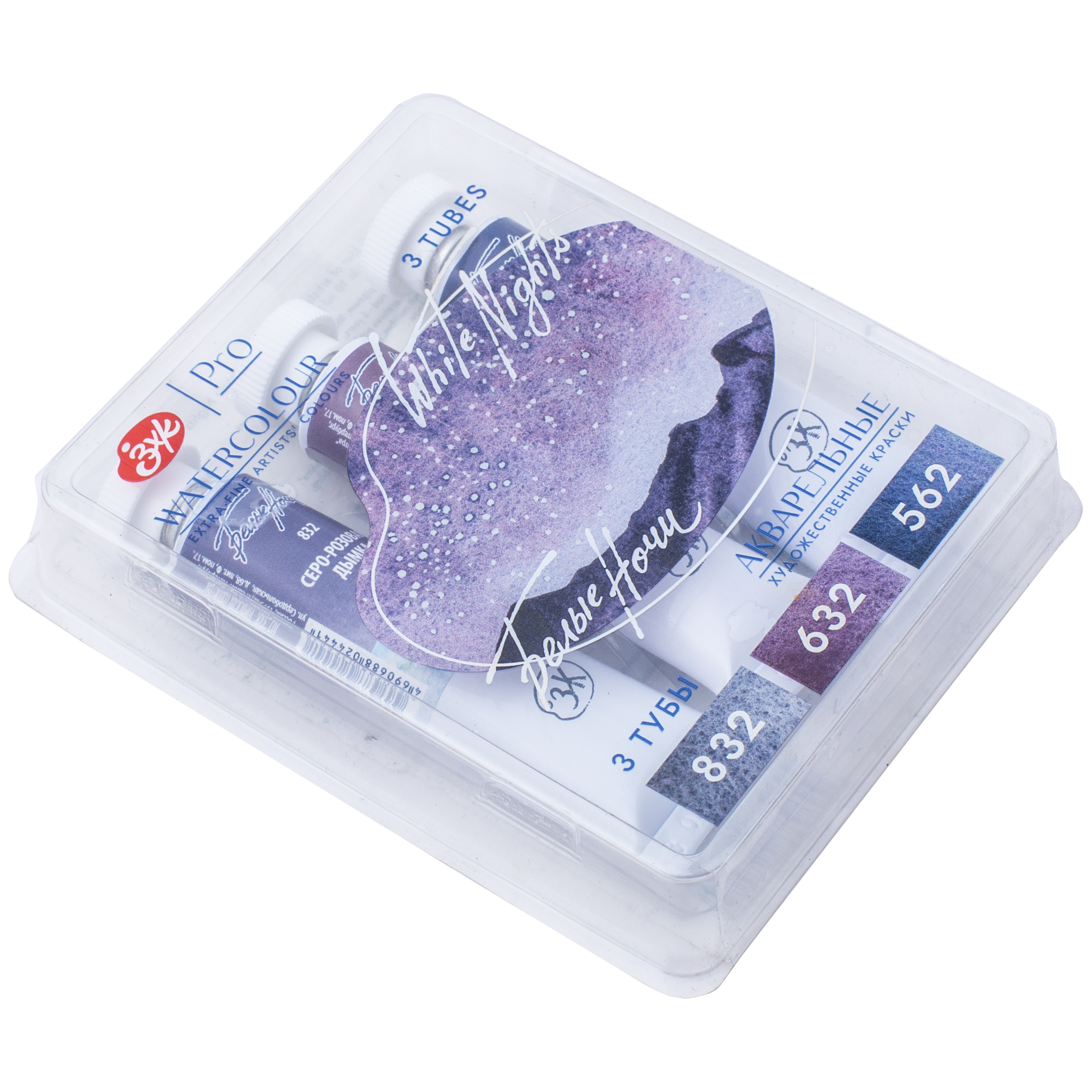 Акварель «Белые ночи» — визитная карточка завода «Невская палитра», эти краски признаны профессиональными художниками и считаются одними из лучших среди отечественных акварелей. Художественные акварельные краски «Белые ночи» изготавливаются из тонкотертых пигментов и связующего из натурального гуммиарабика, признанного лучшим растительным клеем для приготовления художественных водных красок. Максимальная интенсивность цветового тона акварели, сохраняющаяся даже при разбавлении большим количеством воды, достигается благодаря высокой концентрации пигмента и тонкости его перетира. Такие свойства, как яркость и чистота цвета, высокая светостойкость, прекрасная разносимость и прозрачность сделали акварель ЗХК любимыми красками нескольких поколений живописцев. В наборе 3 тубы по 10 мл. в сбалансированной цветовой палитре.