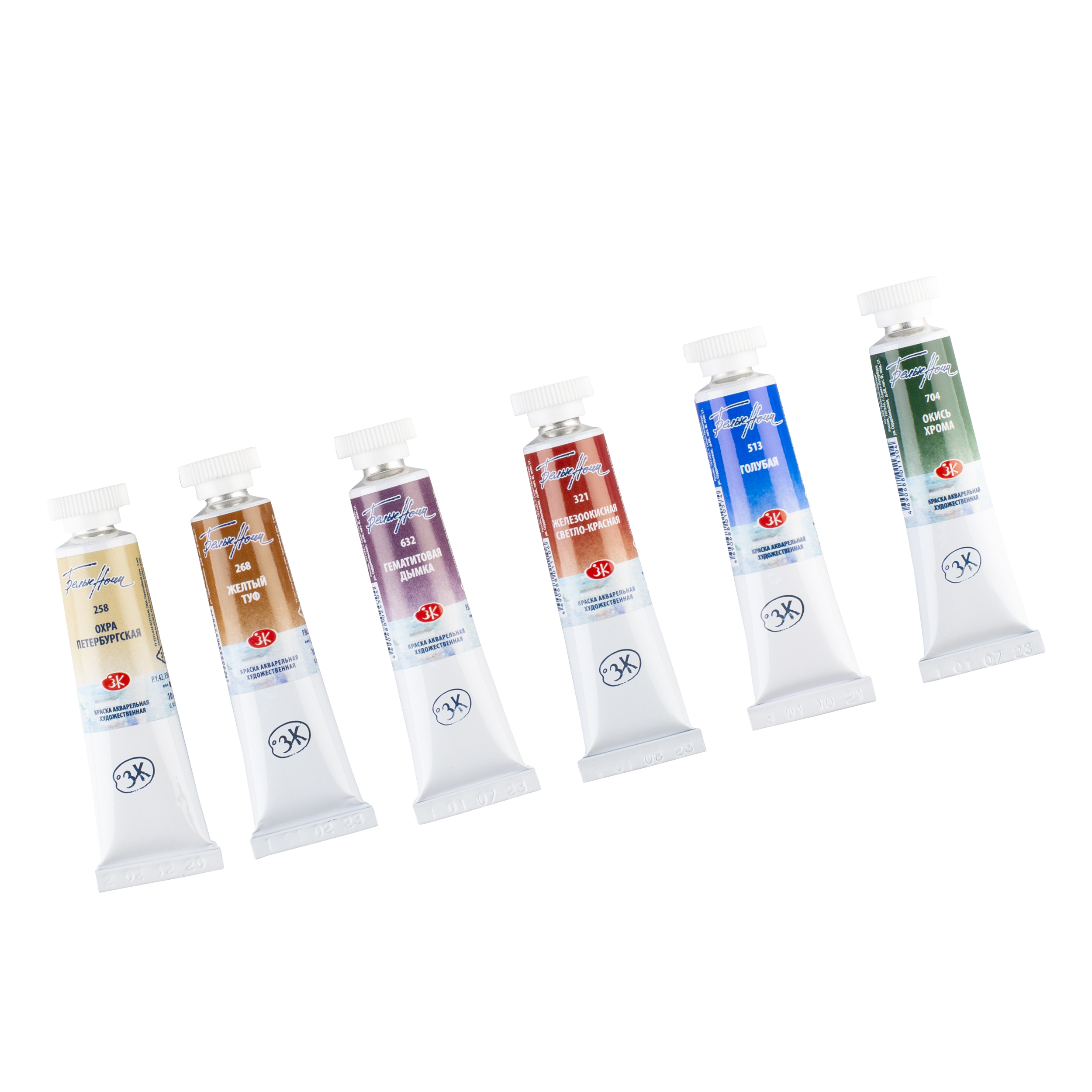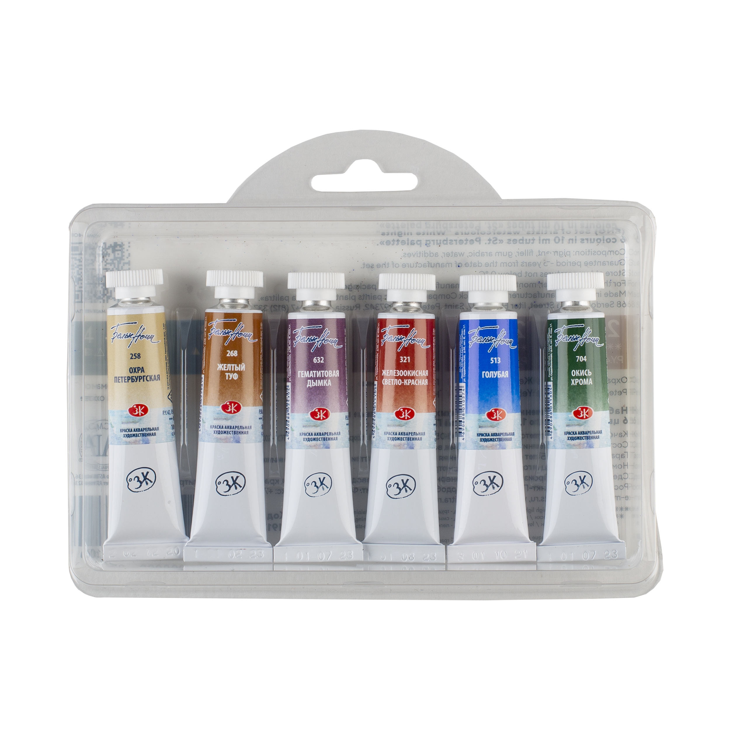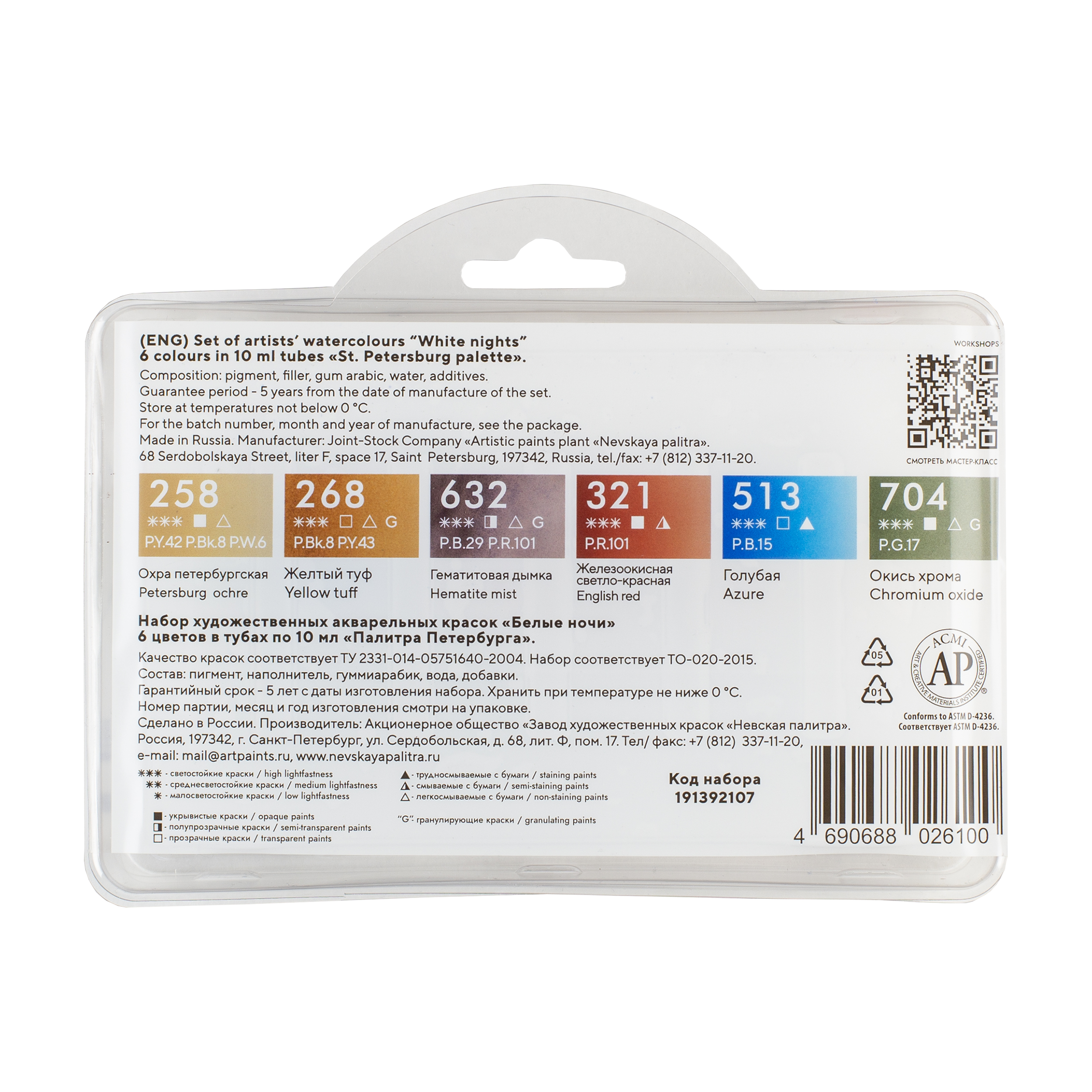 Акварель «Белые ночи» — визитная карточка завода «Невская палитра», эти краски признаны профессиональными художниками и считаются одними из лучших среди отечественных акварелей. Художественные акварельные краски «Белые ночи» изготавливаются из тонкотертых пигментов и связующего из натурального гуммиарабика, признанного лучшим растительным клеем для приготовления художественных водных красок. Максимальная интенсивность цветового тона акварели, сохраняющаяся даже при разбавлении большим количеством воды, достигается благодаря высокой концентрации пигмента и тонкости его перетира. Такие свойства, как яркость и чистота цвета, высокая светостойкость, прекрасная разносимость и прозрачность сделали акварель ЗХК любимыми красками нескольких поколений живописцев. В наборе 6 туб по 10 мл. в сбалансированной цветовой палитре: охра петербургская, желтый туф, гематитовая дымка, железо-окисная светло-красная, голубая, окись хрома.