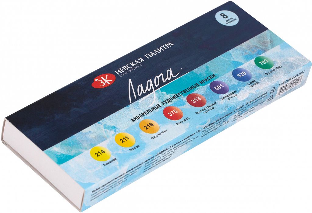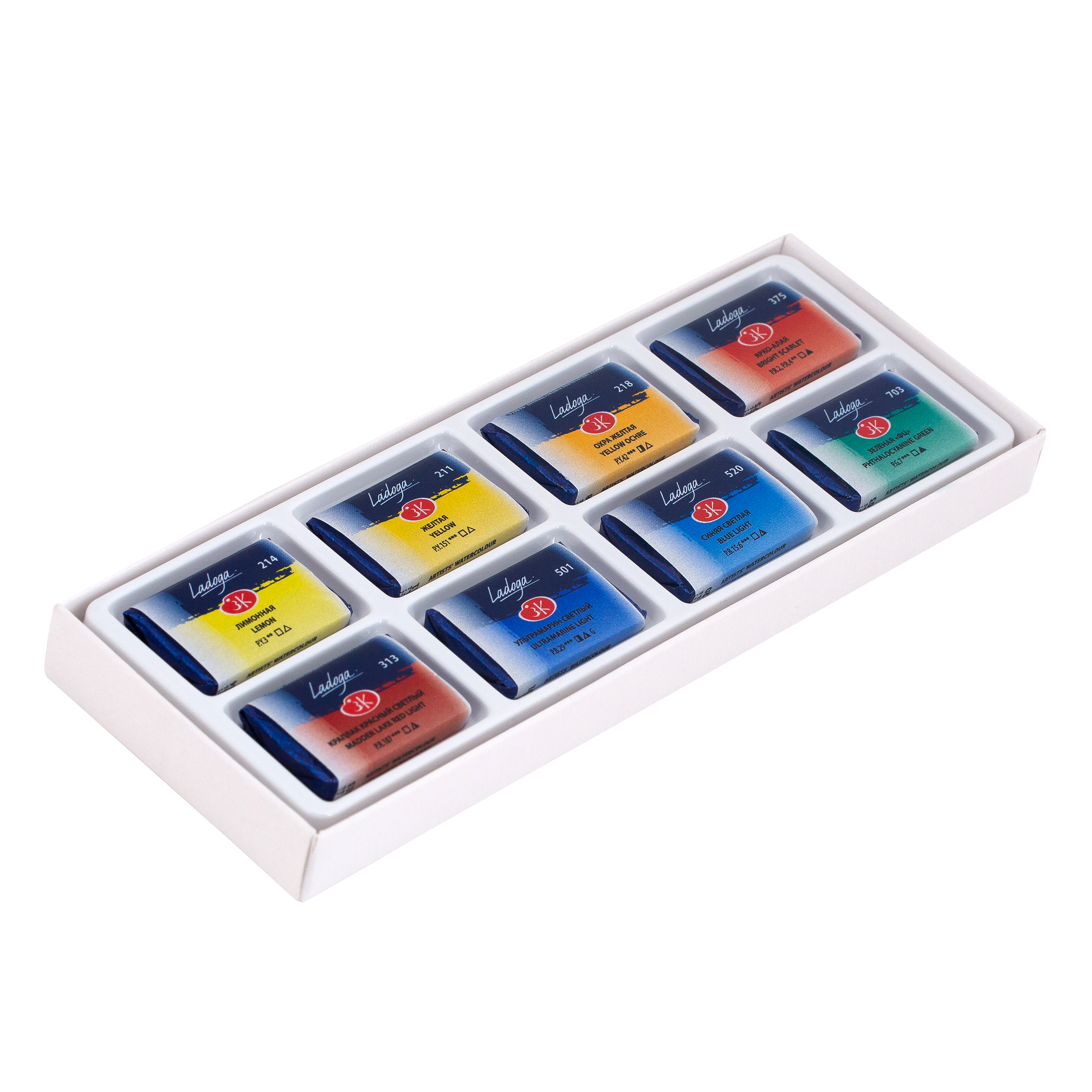 Художественные акварельные краски «Ладога» разработаны для решения творческих задач учащихся профессиональных образовательных учреждений. Рекомендованы для создания этюдов, эскизов, учебных работ. Краски «Ладога» выпускаются с применением синтетических пигментов и гуммиарабика. Цвета в наборе: лимонная, желтая, охра желтая, ярко-алая, краплак красный светлый, ультрамарин светлый, синяя светлая, зеленая ФЦ.