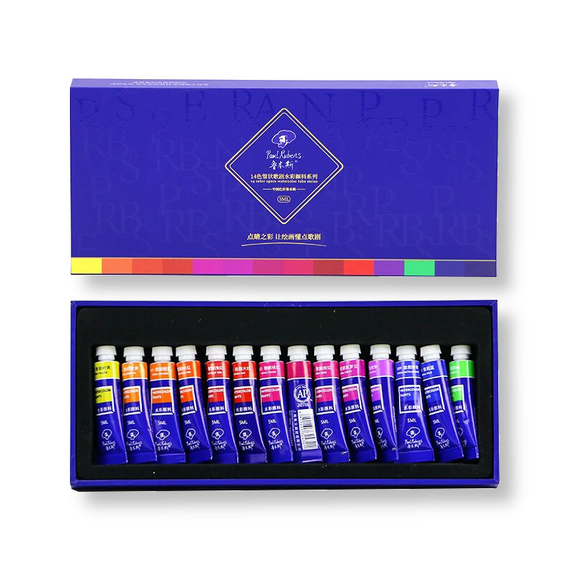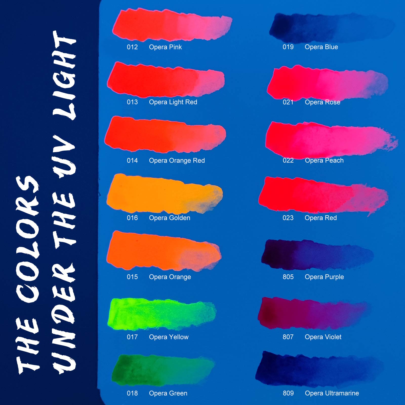 Данный набор состоит из исключительно ярких флуорисцентных цветов, которые обладают наиболее интенсивным цветом по сравнению с классическими цветами акварели. Кроме того, работы, выполненные флуоресцентными красками, светятся под лучами ультрафиолетовых ламп. Обратите внимание, что также цвета могут отличаться в зависимости от цвета бумаги. В наборе 14 туб по 5 мл.