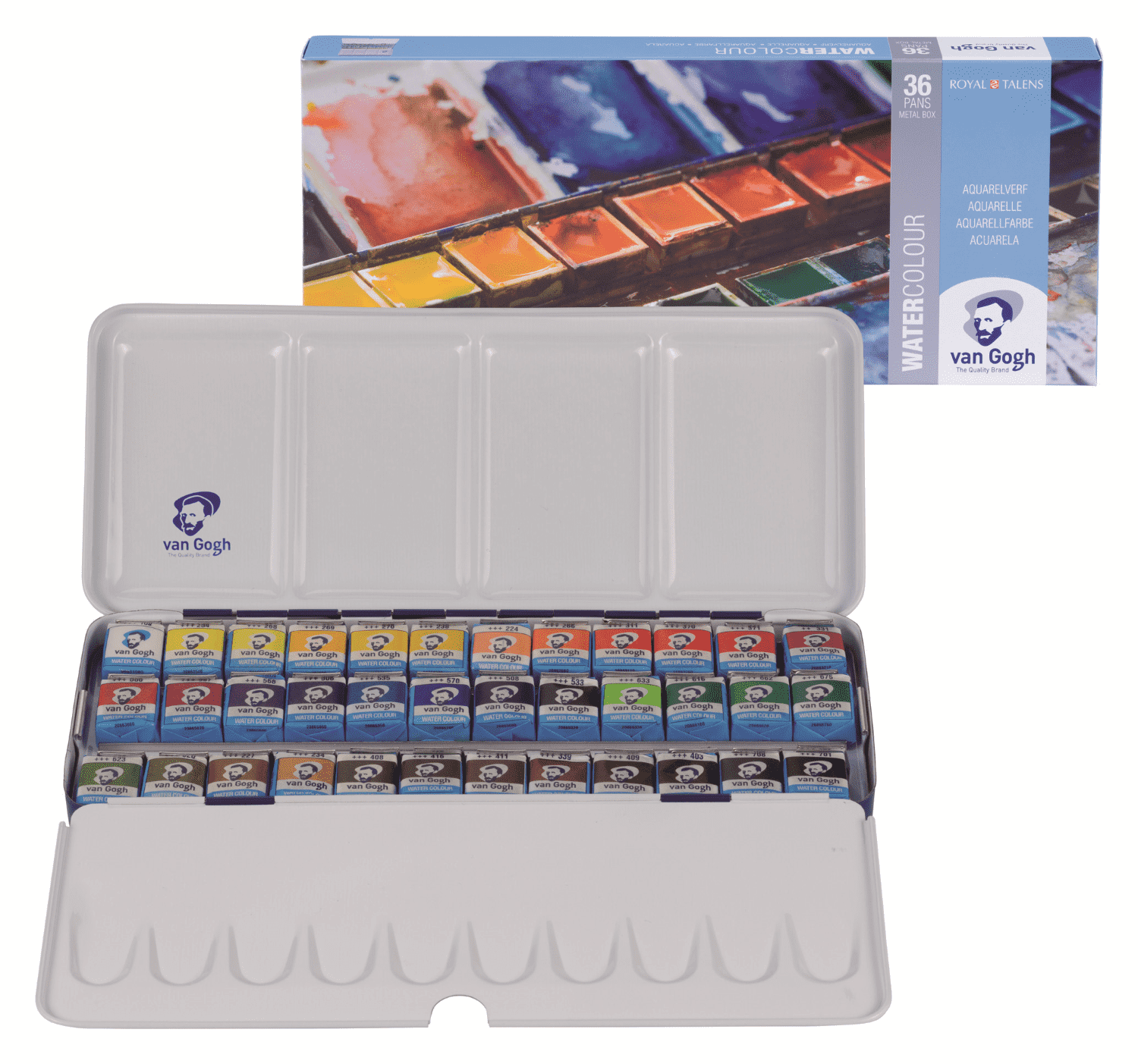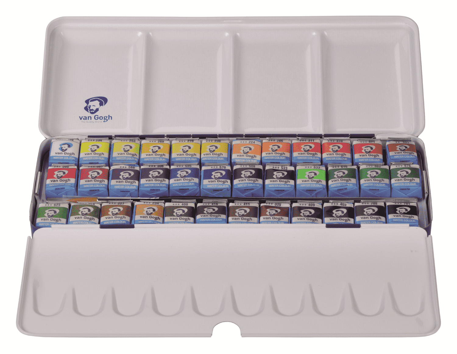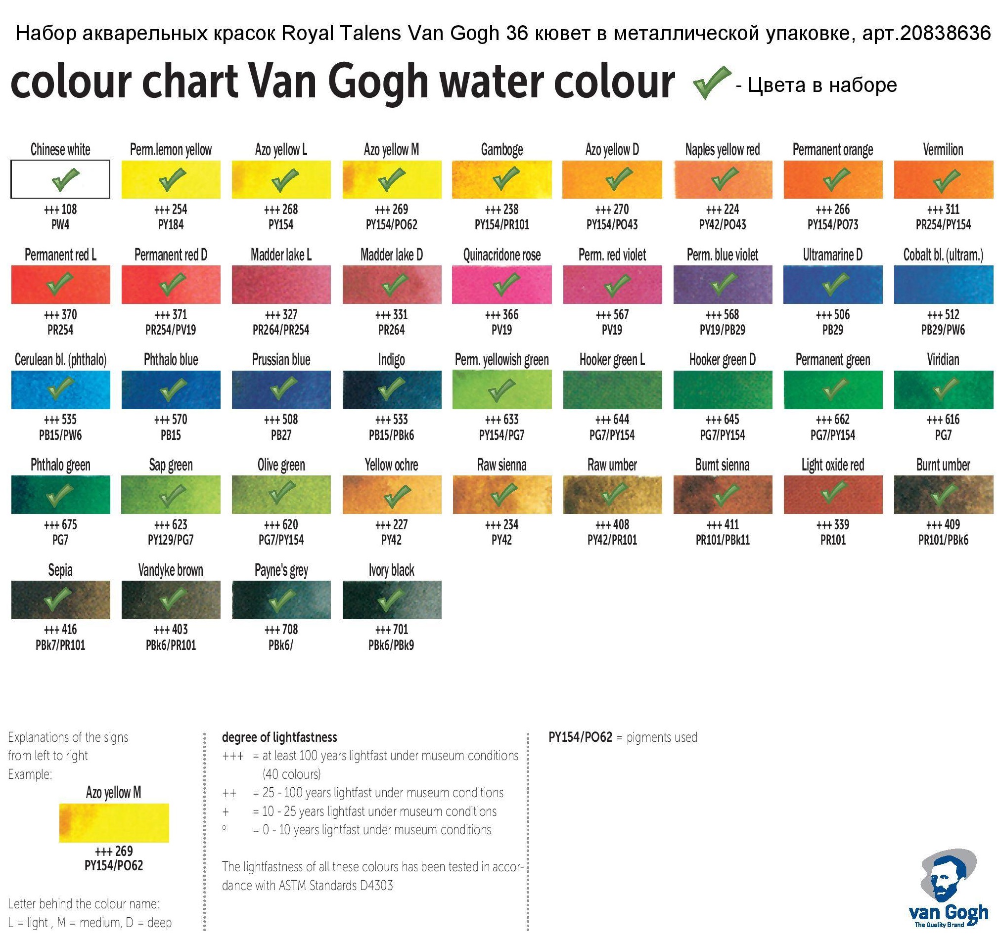 О серии: акварель Van Gogh представлена палитрой из 40 различных цветов. Все цвета выпускаются поштучно в тубах по 10 миллилитров и кюветах по 2,5 миллилитра. Также представлен широкий выбор наборов, которые удобно брать с собой. Комплектация набора: в данный набор входит 36 кюветы акварели Van Gogh и круглая кисть №6 с синтетическим ворсом. Набор упакован в металлический пенал, крышку которого можно использовать в качестве палитры для смешивания цветов. Цвета в наборе отмечены на фото с цветовой гаммой акварели VAn Gogh Характеристика: в состав краски входят пигменты высокой степени очистки и чистый гуммиарабик. Акварель Van Gogh – это прозрачная краска с насыщенными и яркими цветами. Легко наносится на поверхность. Все цвета смешиваются между собой, образуя новые оттенки. Краска, даже сильно разведенная водой, обладает высокой светостойкостью. Уровень Study. Производство: акварельные краски Van Gogh производится в городе Апелдорн голландской компанией ROYAL TALENS. Основал её Мартин Таленс (Marten Talens) в 1899 году. Титул «Royal» (Ройал, королевский) компания получила в 1949 году от королевской четы за высокое качество продукции и следование традициям. ROYAL TALENS производит все виды художественных красок и является одним из ведущих производителей в своей отрасли.