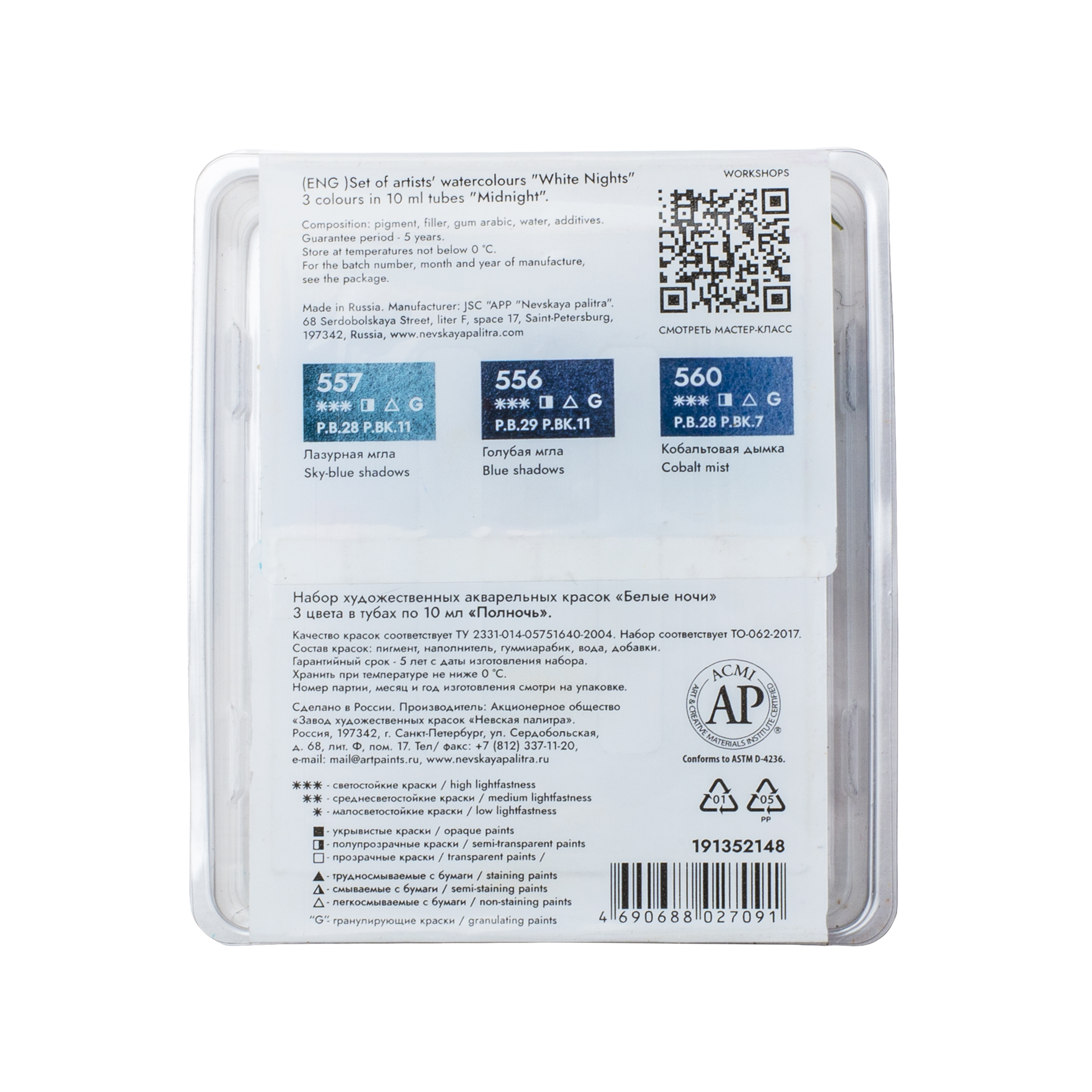 Акварель «Белые ночи» — визитная карточка завода «Невская палитра», эти краски признаны профессиональными художниками и считаются одними из лучших среди отечественных акварелей. Художественные акварельные краски «Белые ночи» изготавливаются из тонкотертых пигментов и связующего из натурального гуммиарабика, признанного лучшим растительным клеем для приготовления художественных водных красок. Максимальная интенсивность цветового тона акварели, сохраняющаяся даже при разбавлении большим количеством воды, достигается благодаря высокой концентрации пигмента и тонкости его перетира. Такие свойства, как яркость и чистота цвета, высокая светостойкость, прекрасная разносимость и прозрачность сделали акварель ЗХК любимыми красками нескольких поколений живописцев. Цвета в наборе: лазурная мгла, голубая мгла, кобальтовая дымка.