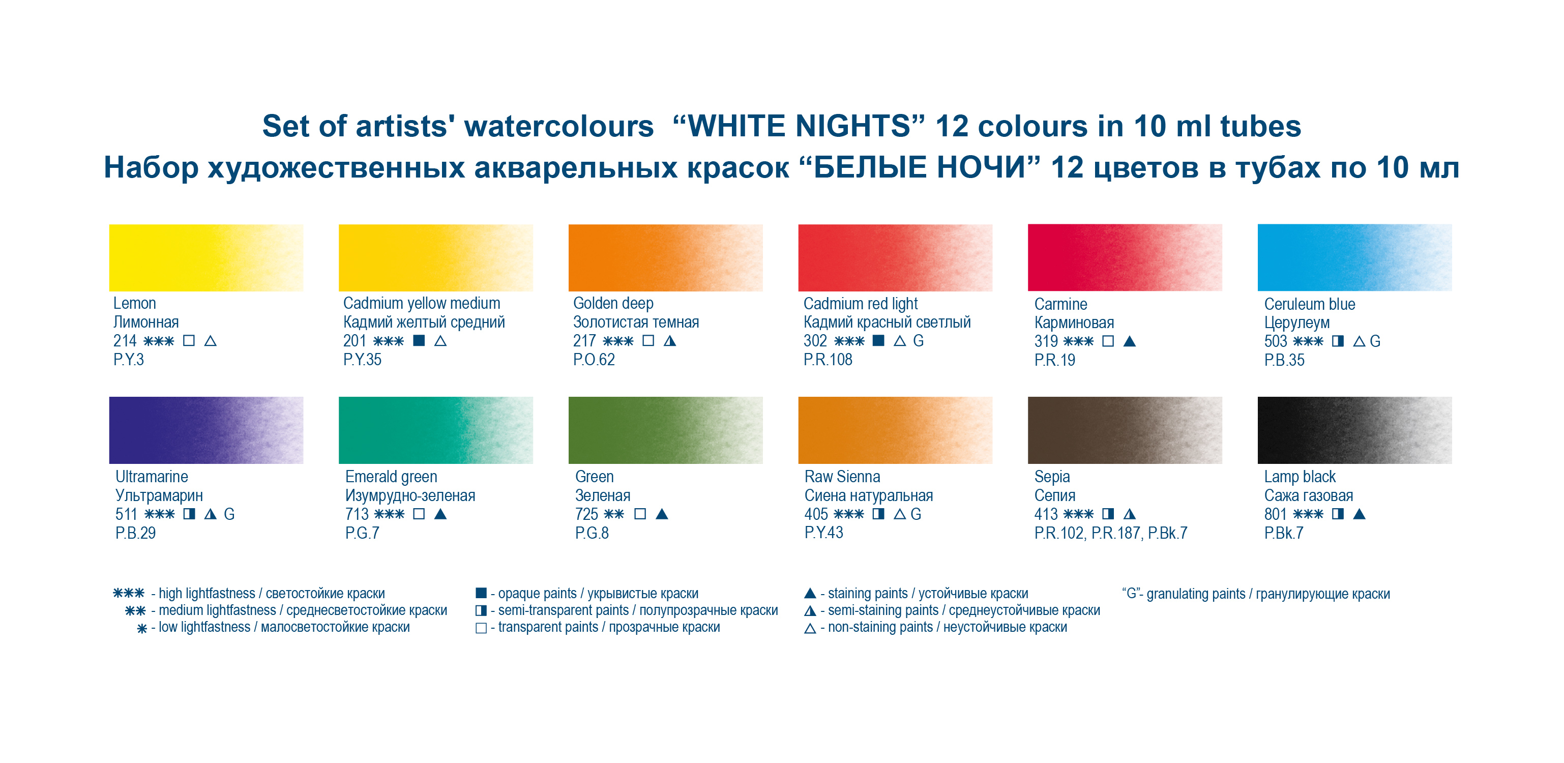 Акварель «Белые ночи» производится заводом художественных красок Невская палитра, расположенным в городе Санкт-Петербурге. Завод уже более 80 лет выпускает продукцию для профессиональных художников и любителей творчества. Художественные акварельные краски «Белые ночи» изготавливаются из тонкотертых пигментов и связующего из натурального гуммиарабика, признанного лучшим растительным клеем для приготовления художественных водных красок. Максимальная интенсивность цветового тона акварели, сохраняющаяся даже при разбавлении большим количеством воды, достигается благодаря высокой концентрации пигмента и тонкости его перетира. Такие свойства, как яркость и чистота цвета, высокая светостойкость, прекрасная разносимость и прозрачность сделали акварель ЗХК любимыми красками нескольких поколений живописцев. На сегодняшний день акварель «Белые ночи» предлагает сбалансированную палитру, насчитывающую 66 цветов, из которых 46 монопигментные. Основная часть обладает средним и высоким показателем светостойкости. Акварель «Белые ночи» выпускается в кюветах и в тубах в наборах различной комплектации и поштучно.