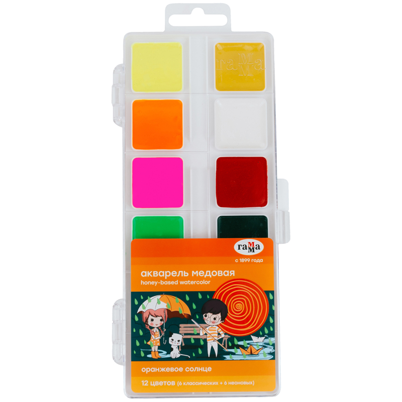 Медовая акварель «Оранжевое солнце» имеет расширенную палитру цветов, включающую классические цвета и цвета с различными эффектами. В наборе: 6 классических и 6 флуоресцентных цветов. «Волшебные» цвета дают возможность проявить фантазию и создать любой сказочный сюжет. Краски нетоксичны, легко смываются с рук и отстирывается с одежды, хорошо смешиваются. Кюветы с высокими бортиками и увеличенным расстоянием между красками предназначены для удобства в работе детей. Палитра для смешивания красок расположена на крышке. Объем кювет - 3,14 см3. Форма кювет - квадратная.