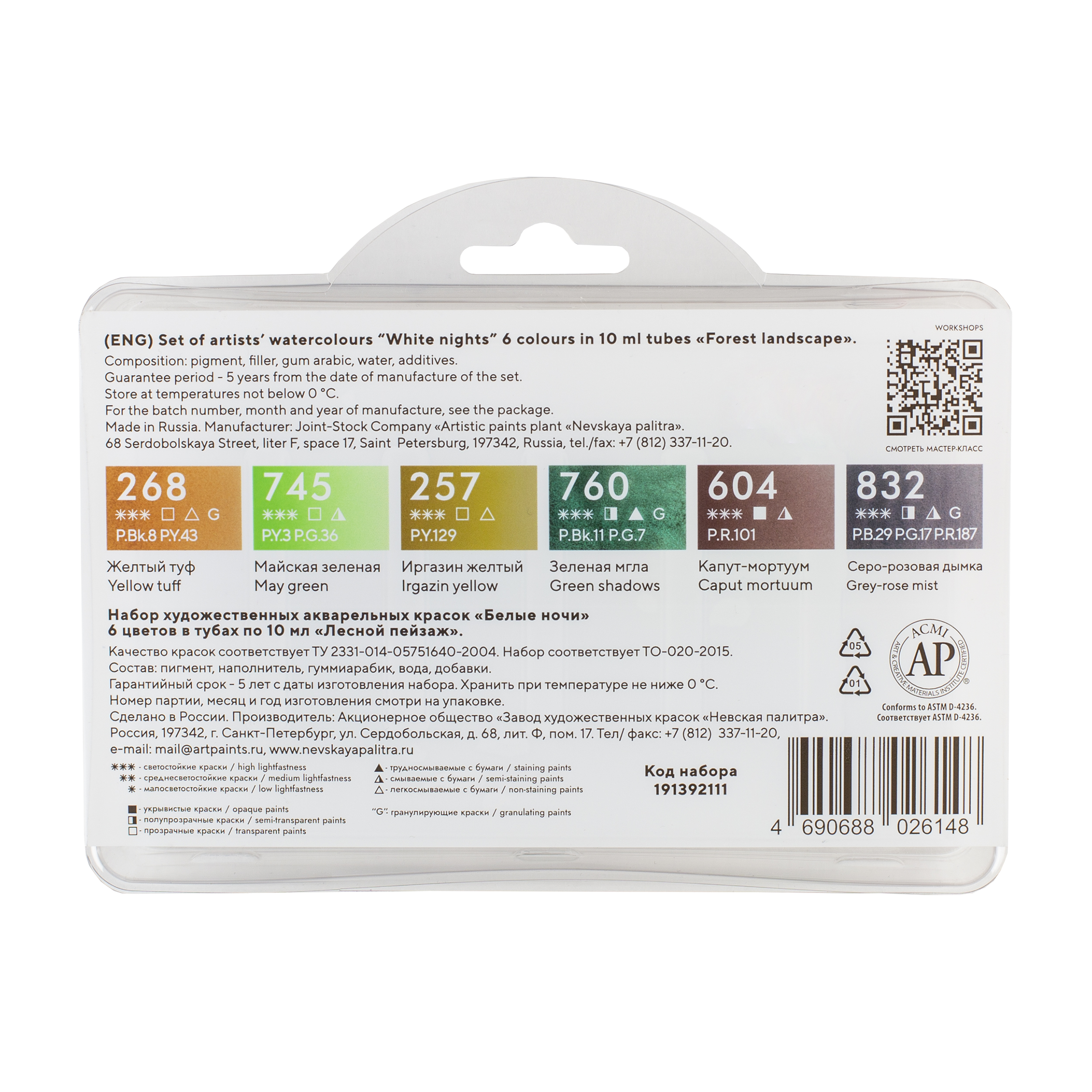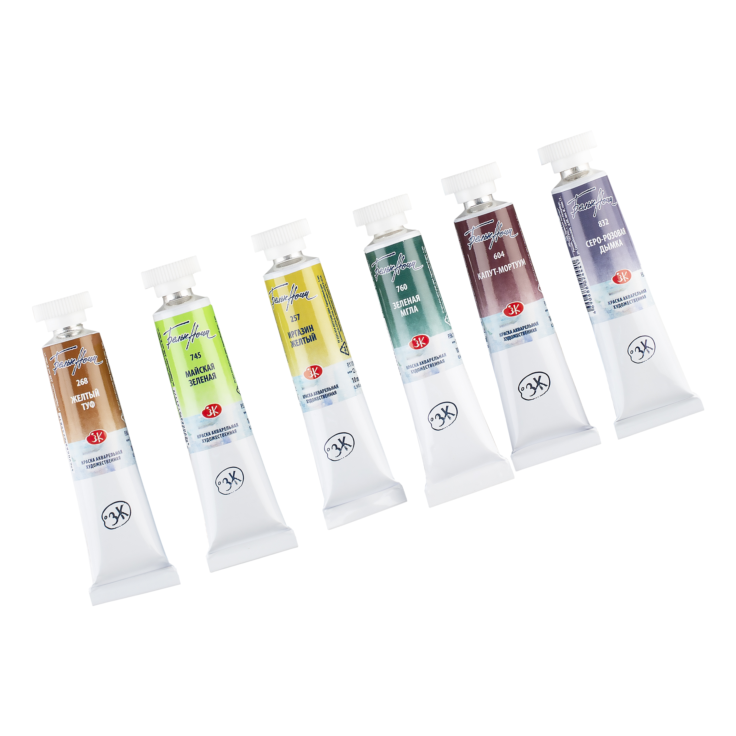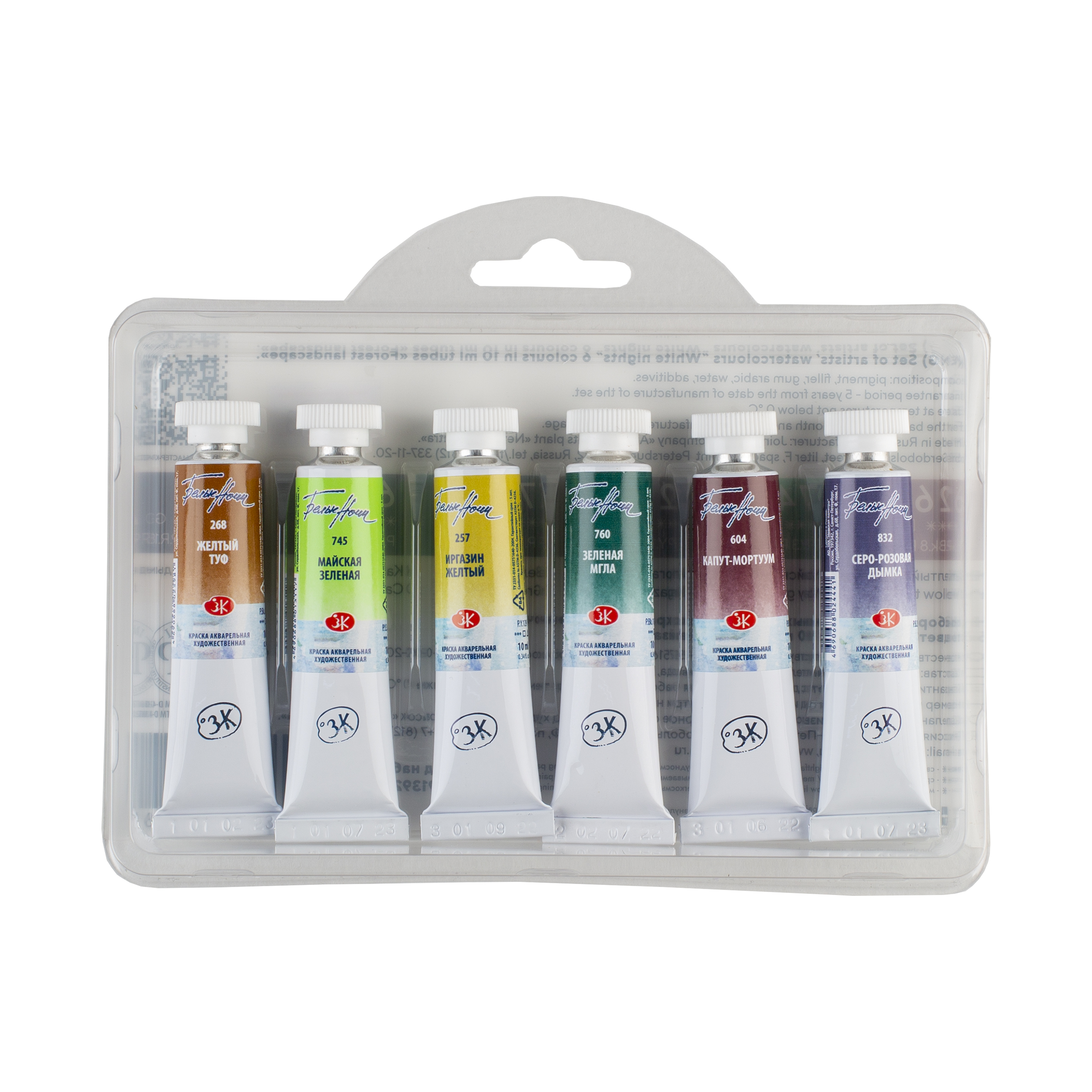 Акварель «Белые ночи» — визитная карточка завода «Невская палитра», эти краски признаны профессиональными художниками и считаются одними из лучших среди отечественных акварелей. Художественные акварельные краски «Белые ночи» изготавливаются из тонкотертых пигментов и связующего из натурального гуммиарабика, признанного лучшим растительным клеем для приготовления художественных водных красок. Максимальная интенсивность цветового тона акварели, сохраняющаяся даже при разбавлении большим количеством воды, достигается благодаря высокой концентрации пигмента и тонкости его перетира. Такие свойства, как яркость и чистота цвета, высокая светостойкость, прекрасная разносимость и прозрачность сделали акварель ЗХК любимыми красками нескольких поколений живописцев. В наборе 6 туб по 10 мл. в сбалансированной цветовой палитре: желтый туф, майская зелёная, иргазин жёлтый, зелёная мгла, капут-мортуум, серо-розовая дымка.