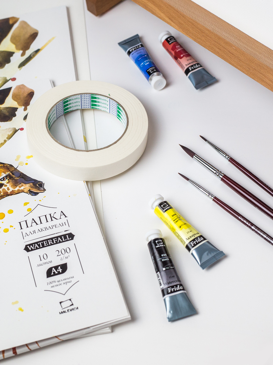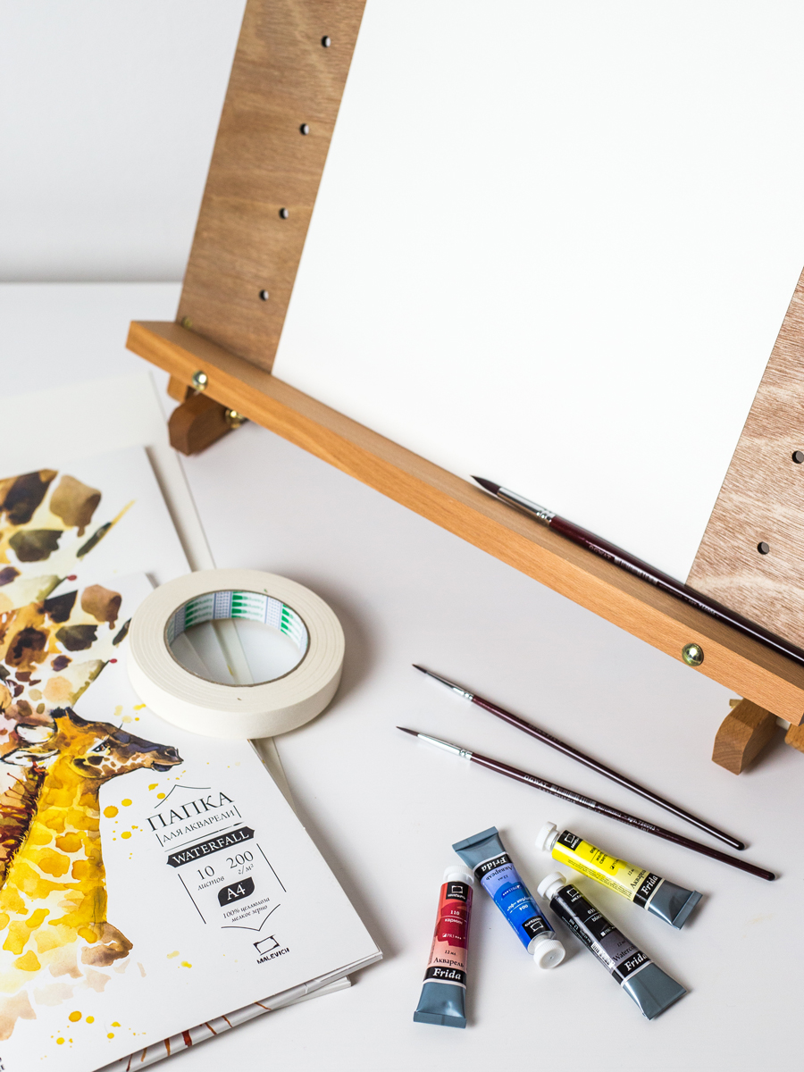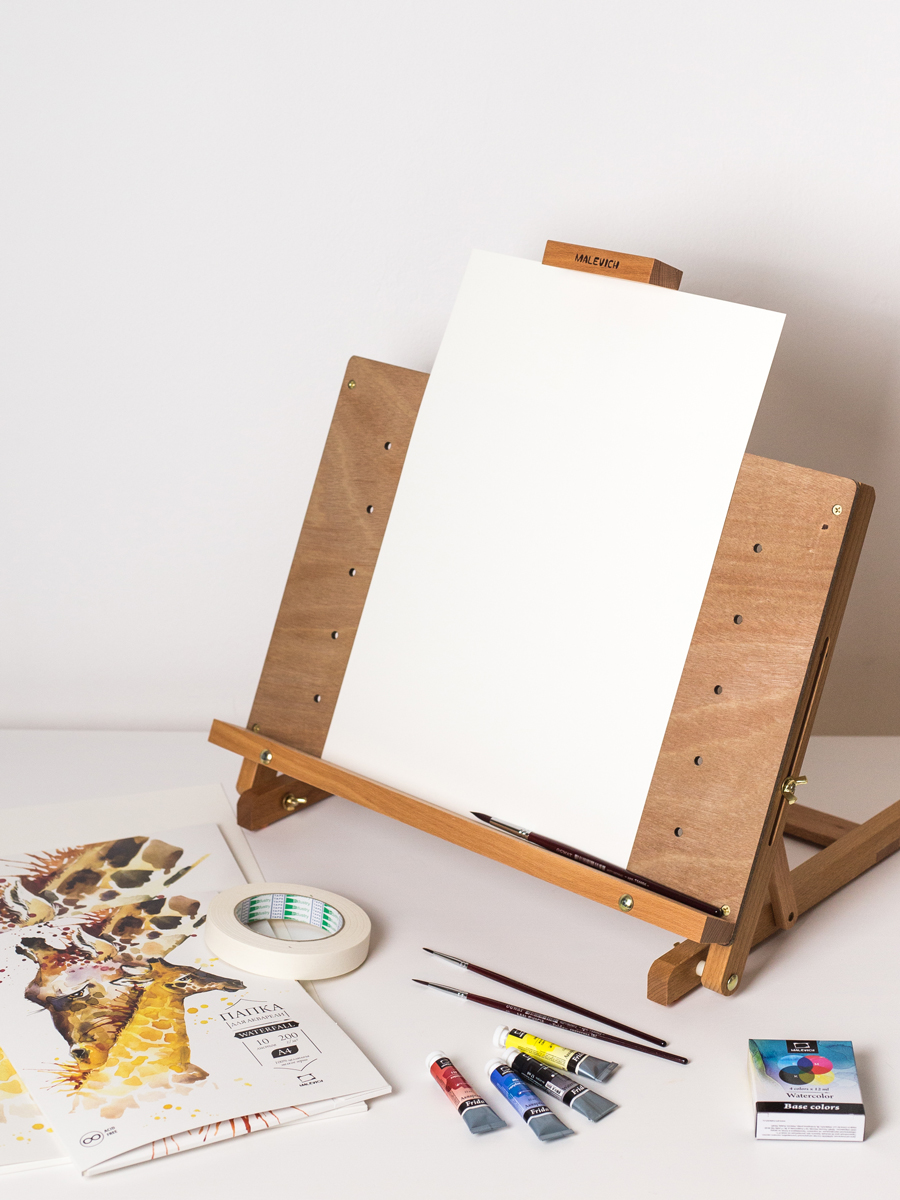 Набор подойдет любителям акварельной живописи. В составе удобный настольный мольберт с регулируемым углом наклона, который подходит для рисования на бумаге, кисти из синтетики для рисования акварелью, бумага для акварели формата А4 и А3 по 10 листов.