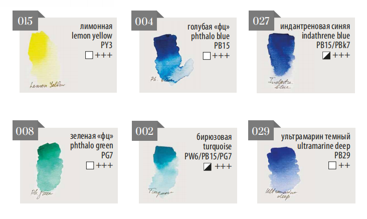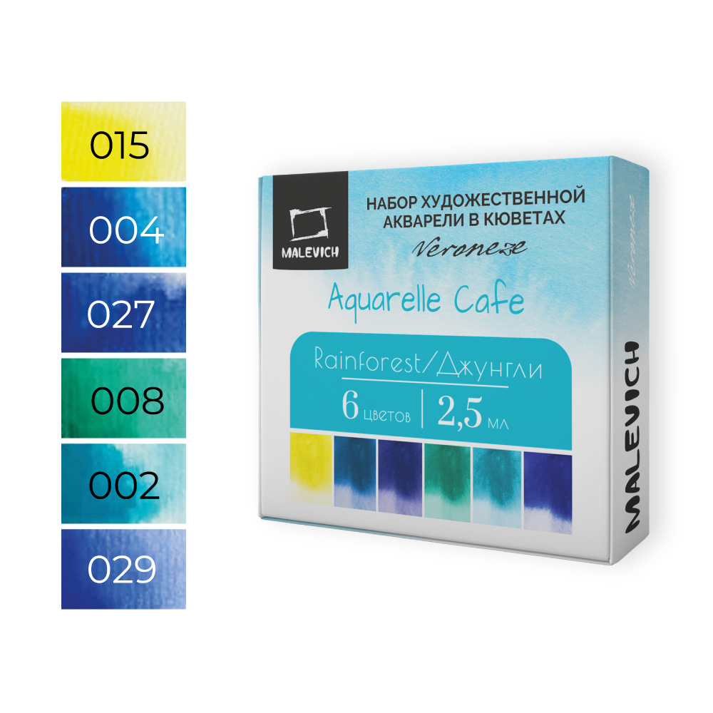 Серия акварели «Малевичъ» Veroneze из 25 цветов создана совместно с российскими художницами из творческого онлайн журнала. Она содержит базовые цвета, а дополнительные оттенки подобраны таким образом, чтобы исключить некрасивые тусклые и глухие смеси. Все краски яркие, прозрачные и полупрозрачные, легко набираются, прекрасно смешиваются и дают ровные заливки. Есть и пара гранулирующих цветов, которые помогут создать волшебные фактуры и эффекты. Акварель создана без использования соединений кадмия и животных компонентов. В наборе 6 цветов.