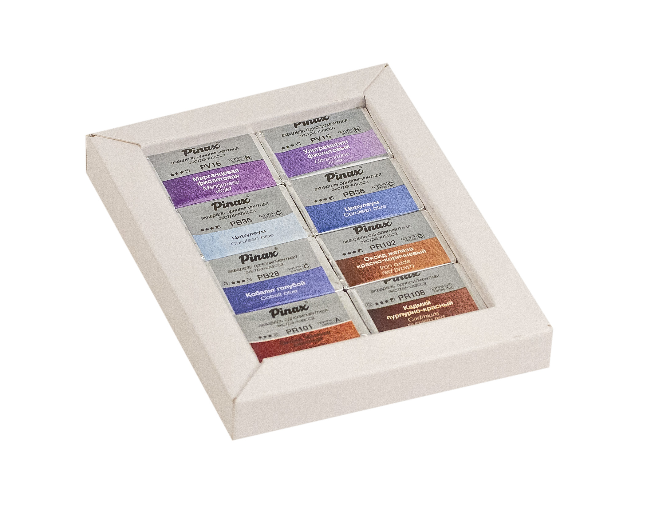 Профессиональная акварель Pinax EXTRA характеризуется применением лучших пигментов и натурального высококачественного гуммиарабика. Высокая степень перетира на краскотерках с керамическими валами, а также максимальная концентрация пигмента позволяют получать цвета с непревзойденной прозрачностью, чистотой и насыщенностью цвета. Краски прекрасно смешиваются и идеально подходят для всех акварельных техник. Только цвета, сделанные на основе пигментов с максимальной светостойкостью, могут войти в серию EXTRA. В этой линейке акварельных красок Pinax намерено решили отказаться от маркетинговых названий цветов, использовав взамен имя пигмента, сосредоточив фокус на том что действительно важно. Это нашло продолжение в дизайне этикетки – цветовой индекс пигмента расположен по центру этикетки. В наборе 8 гранулирующих цветов: Марганцевая фиолетовая; Ультрамарин фиолетовый; Церулеум светлый; Церулеум; Кобальт голубой; Оксид железа красно-коричневый; Оксид железа светлый; Кадмий пурпурно-красный.