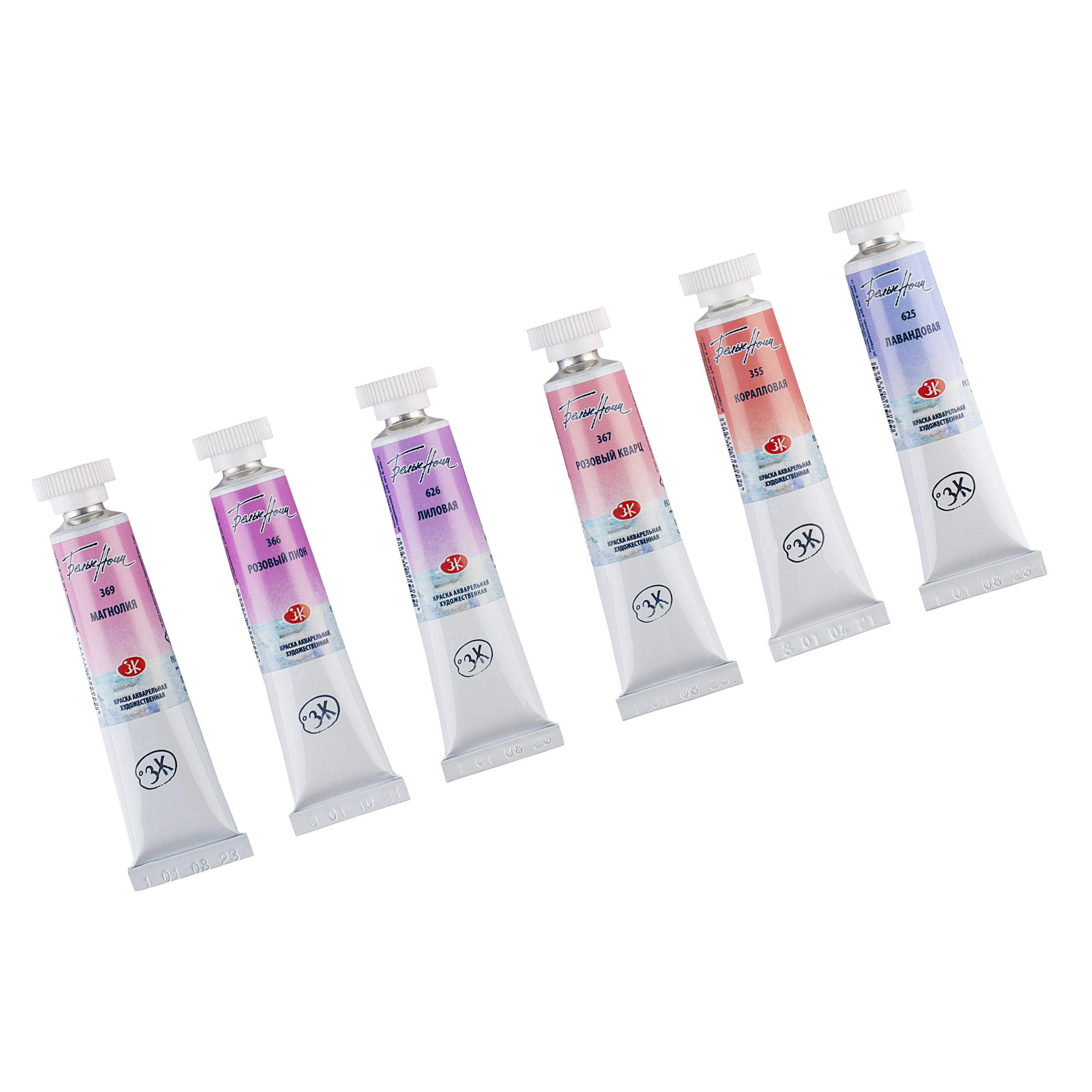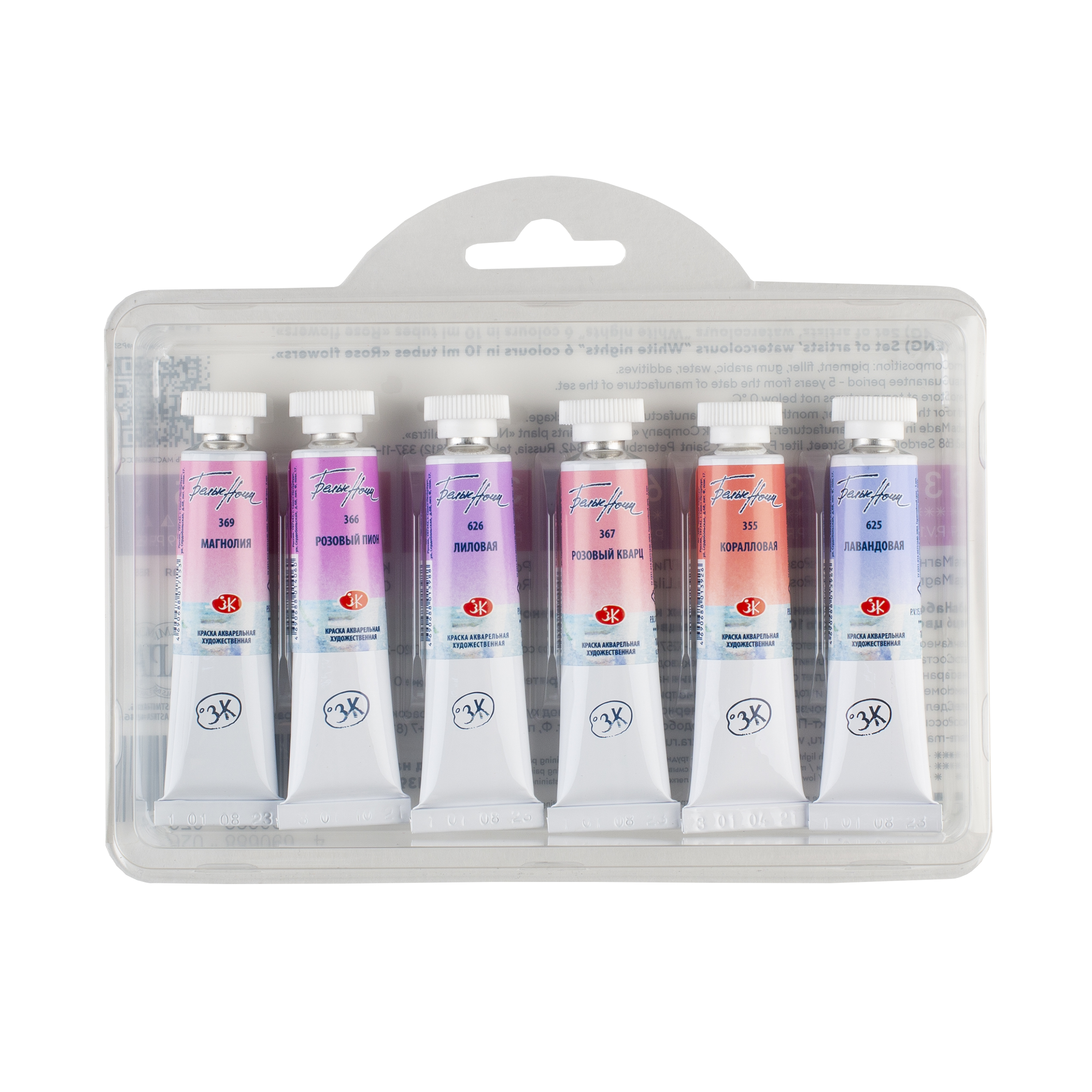 Акварель «Белые ночи» — визитная карточка завода «Невская палитра», эти краски признаны профессиональными художниками и считаются одними из лучших среди отечественных акварелей. Художественные акварельные краски «Белые ночи» изготавливаются из тонкотертых пигментов и связующего из натурального гуммиарабика, признанного лучшим растительным клеем для приготовления художественных водных красок. Максимальная интенсивность цветового тона акварели, сохраняющаяся даже при разбавлении большим количеством воды, достигается благодаря высокой концентрации пигмента и тонкости его перетира. Такие свойства, как яркость и чистота цвета, высокая светостойкость, прекрасная разносимость и прозрачность сделали акварель ЗХК любимыми красками нескольких поколений живописцев. В наборе 6 туб по 10 мл. в сбалансированной цветовой палитре: магнолия, розовый пион, лиловая, розовый кварц, коралловая, лавандовая.