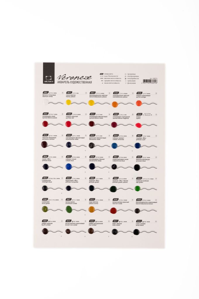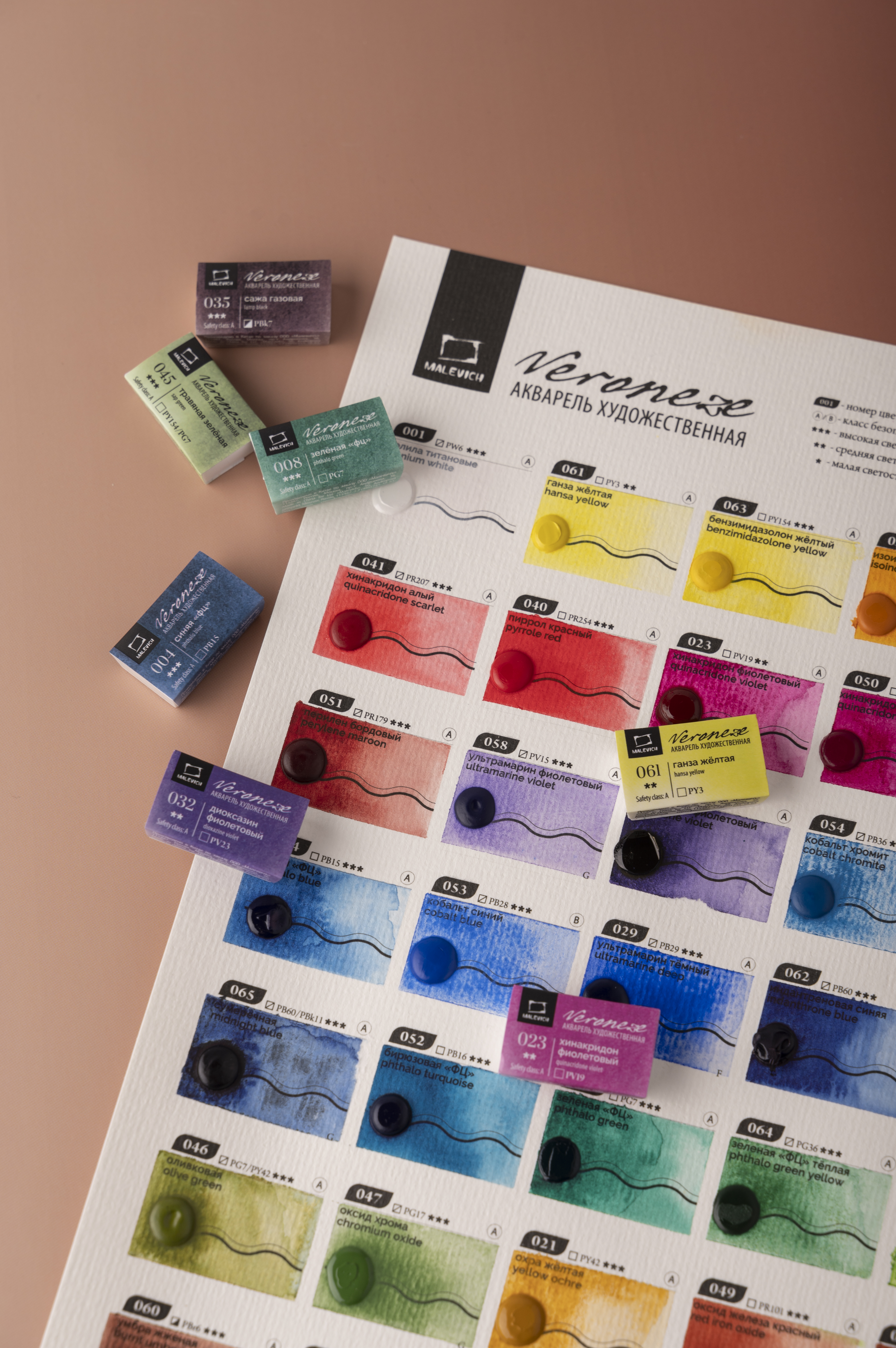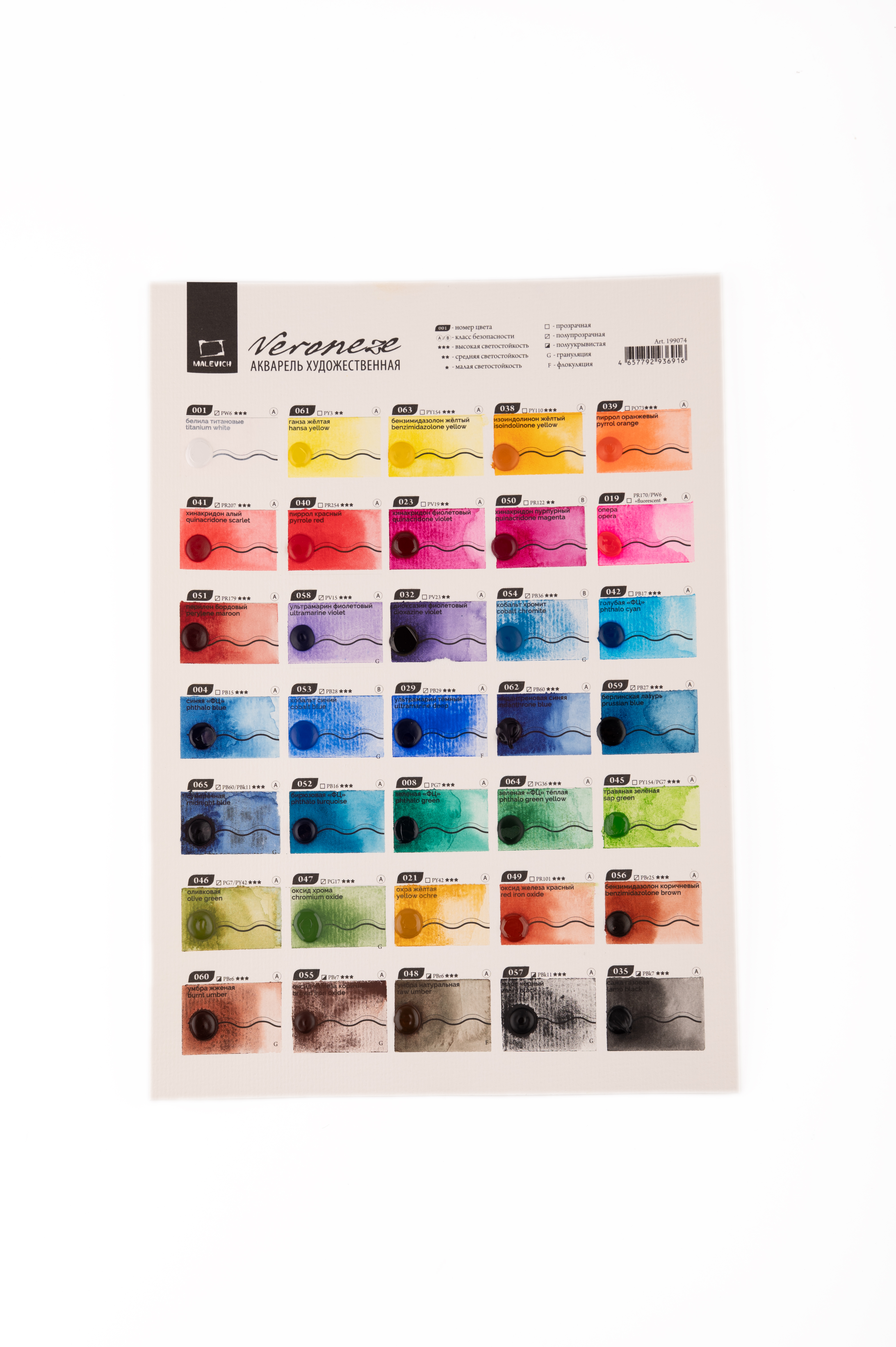 Дот-карта акварели Veroneze – это высушенные капли краски на акварельной бумаге. Карта предназначена не только для тестирования краски, также можно выполнить небольшой этюд или несколько небольших скетчей. Капли легко можно размочить водой и кистью и попробовать краски на укрывистость и собрать палитру цветов для себя. Акварель «Малевичъ» производится на высококачественных, тщательно подобранных пигментах. Акварельные краски Veroneze подходят как для любителей и начинающих художников, так и для профессионалов или иллюстраторов. Высокая светостойкость поможет сохранить работы на долгие годы неизменными. Для дот-карты была выбрана плотная акварельная бумага Waterfall 300 г/м2.