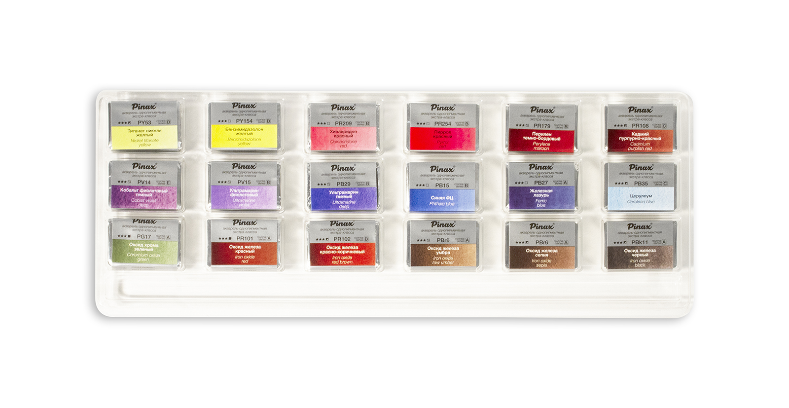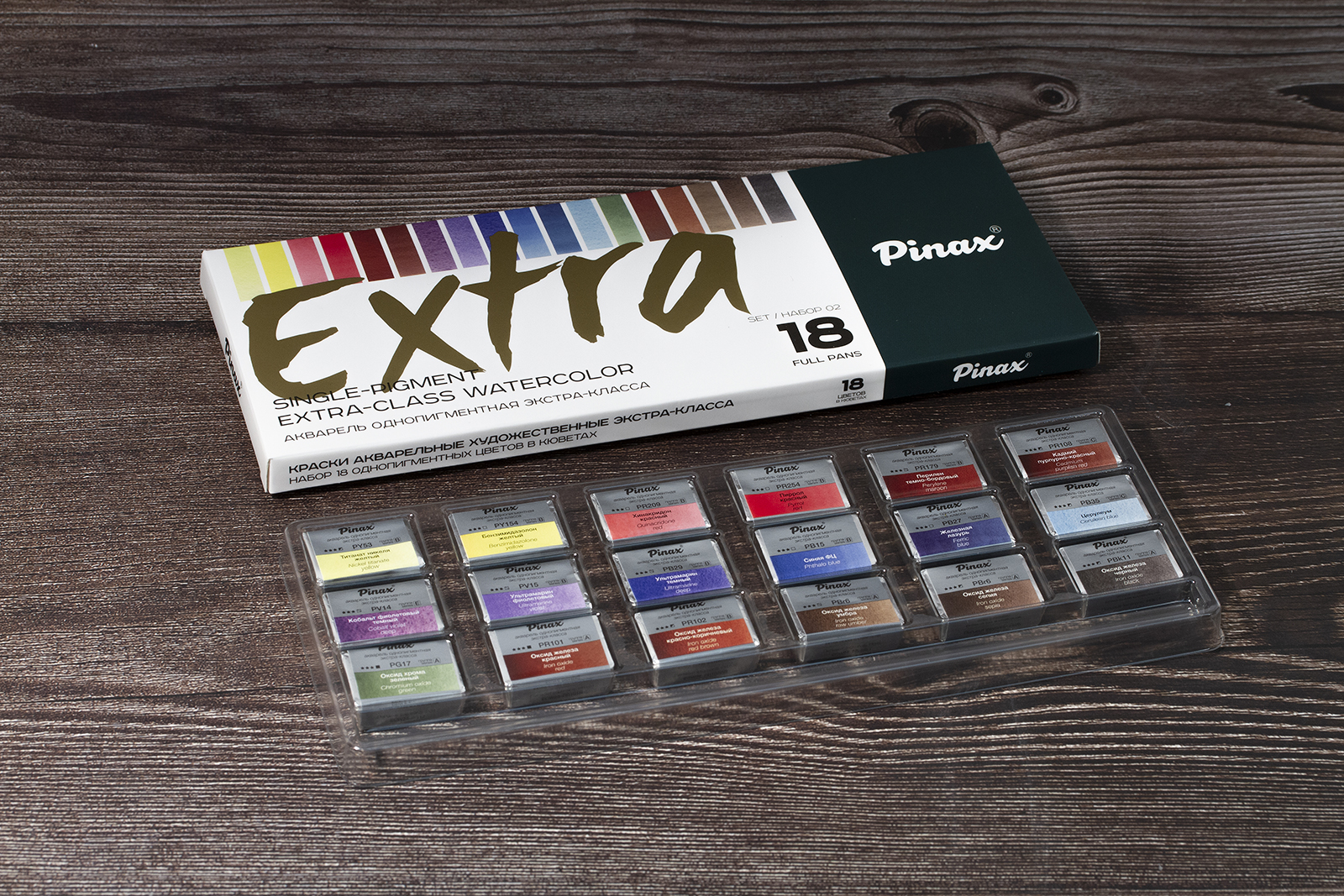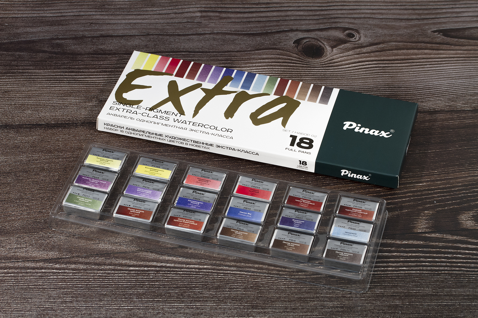 Профессиональная акварель Pinax EXTRA характеризуется применением лучших пигментов и натурального высококачественного гуммиарабика. Высокая степень перетира на краскотерках с керамическими валами, а также максимальная концентрация пигмента позволяют получать цвета с непревзойденной прозрачностью, чистотой и насыщенностью цвета. Краски прекрасно смешиваются и идеально подходят для всех акварельных техник. Только цвета, сделанные на основе пигментов с максимальной светостойкостью, могут войти в серию EXTRA. В этой линейке акварельных красок Pinax намерено решили отказаться от маркетинговых названий цветов, использовав взамен имя пигмента, сосредоточив фокус на том что действительно важно. Это нашло продолжение в дизайне этикетки – цветовой индекс пигмента расположен по центру этикетки. Для достижения максимальной прозрачности и чистоты цвета при производстве акварели серии Pinax EXTRA значимы следующие факторы: краски перетираются на краскотерках с керамическими валами, чтобы добиться абсолютной чистоты цвета и оптимальной дисперсии пигментов; в отличие от металлических валов, используемых при производстве красок большинством производителей, керамические валы не дают металлического загрязнения краски и практически не нагреваются при трении, что позволяет получать при заводском производстве краску лабораторного уровня качества; акварель производится в России на новейшем оборудовании, используя современные методы производства; в производстве применяются только чистейшие пигменты высшего качества от лучших мировых производителей со всего мира; контроль качества сырья и на каждом этапе производства. Цвета в наборе: титанат никеля желтый, бензимидазолон желтый, хинакридон красный, кобальт фиолетовый темный, ультрамарин фиолетовый, ультрамарин темный, оксид хрома зеленый, оксид железа красный, оксид железа красно-коричневый, пиррол красный, синяя ФЦ, оксид железа умбра, перилен темно-бордовый, железная лазурь, оксид железа сепия.