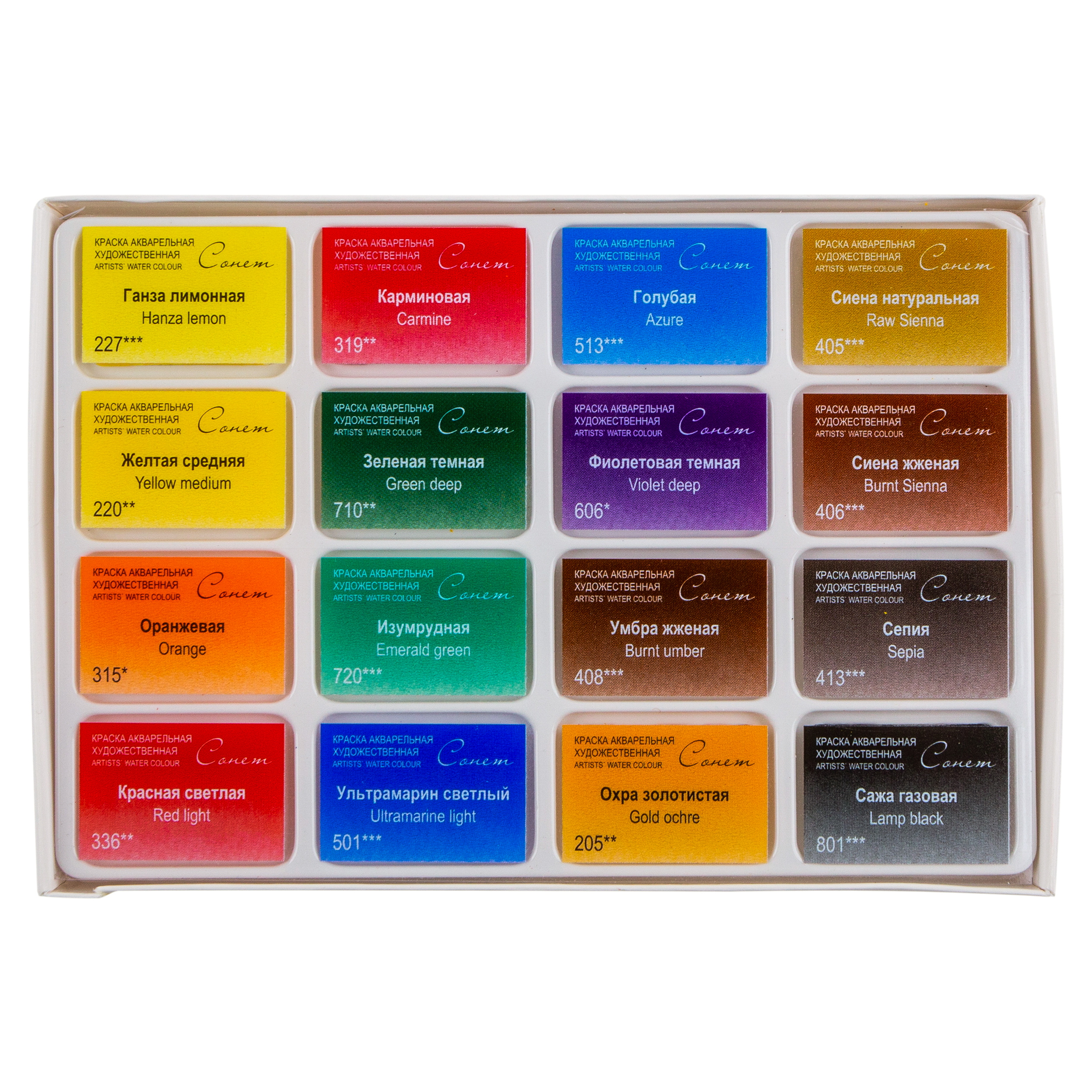 Акварель «Сонет» сочетает в себе основные свойства акварельных красок – прозрачность, интенсивность и чистоту цвета. Все цвета смешиваются между собой, хорошо размываются. Акварелью в кюветах можно заменить закончившиеся краски из набора, что очень удобно. Акварель «Сонет» выпускается в наборах состоящих из 16 и 24 цветов. Цвета в наборе: Ганза лимонная, Желтая средняя, Оранжевая, Красная светлая, Карминовая, Зеленая темная, Изумрудная, Ультрамарин светлый, Голубая, Фиолетовая темная, Умбра жженая, Сепия, Сажа газовая. Акварель «Сонет» производится заводом художественных красок Невская палитра, расположенным в городе Санкт-Петербурге. Завод уже более 80 лет выпускает продукцию для профессиональных художников и любителей творчества.