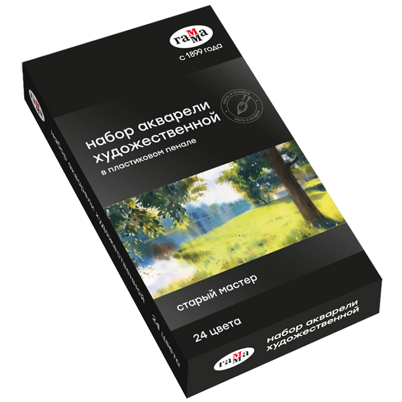 Акварельные краски профессиональной серии «Старый мастер» разработаны в собственной исследовательской лаборатории завода. Краски изготовлены на основе органических и неорганических пигментов и гуммиарабика высшего качества. Цвета акварельных красок звонкие, чистые, прозрачные. Краски высокопигментированные, интенсивные, легко набираются на кисть. Маркировка светостойкости, колор-индекса и укрывистисти указана на упаковке. Набор поставляется в пластиковом пенале с дополнительной палитрой. Иллюстрация для упаковки предоставлена Сергеем Курбатовым. Цвета в наборе: лимонная, кадмий желтый средний, индийская желтая, кадмий оранжевый светлый, хинакридон алый, красно-розовый хинакридон, пурпурный хинакридон, фиолетовый диоксазин, ультрамарин, кобальт синий, голубая ФЦ, индиго, бирюзовая, зеленая темная, оливковая, зеленый неон, охра желтая, английская красная, сиена жженая, умбра жженая, умбра натуральная, сепия, нейтральная черная, белила титановые.