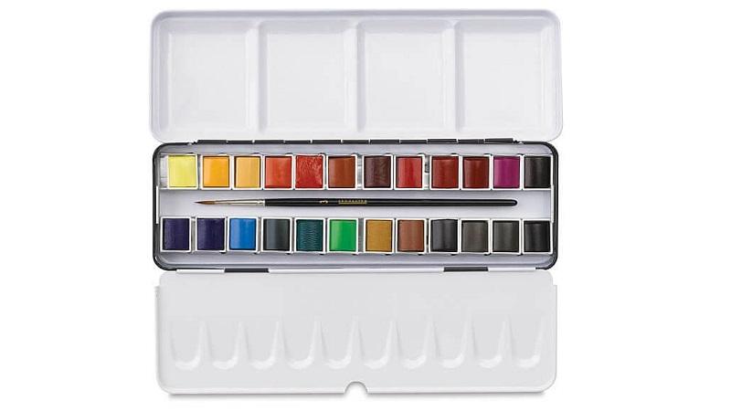 Комплектация: в наборе 24 небольшие кюветы с акварельной краской серии «Artists» и кисть . Набор упакован в пластиковый пенал, который удобно брать на пленэры. О серии: краски «Artists» иногда называют «L'aquarelle». Она изготавливалась с учётом потребностей современных мастеров, сохраняя при этом традиции прошлого. Акварель этой серии отличается высоким качеством и высокой концентрацией пигмента. Пигменты для всех красок Sennelier дополнительно перетираются на гранитных жерновах. В серии представлено 98 цветов. Краски выпускаются поштучно (в кюветах и тубах) и в наборах различной комплектации. Характеристика: все цвета отличаются глубиной цвета и яркими оттенками. Краски хорошо смешиваются между собой. Применение: для художественных и живописных работ. Производство: производится французской компанией «Sennelier». Начало ее заложил Гюстав Сеннель? (Gustave Sennelier) в 1887 году, когда стал задумываться о собственном производстве высококачественных красок и выкупил для себя художественный магазин. На сегодняшний день компания производит все виды красок для творчества.