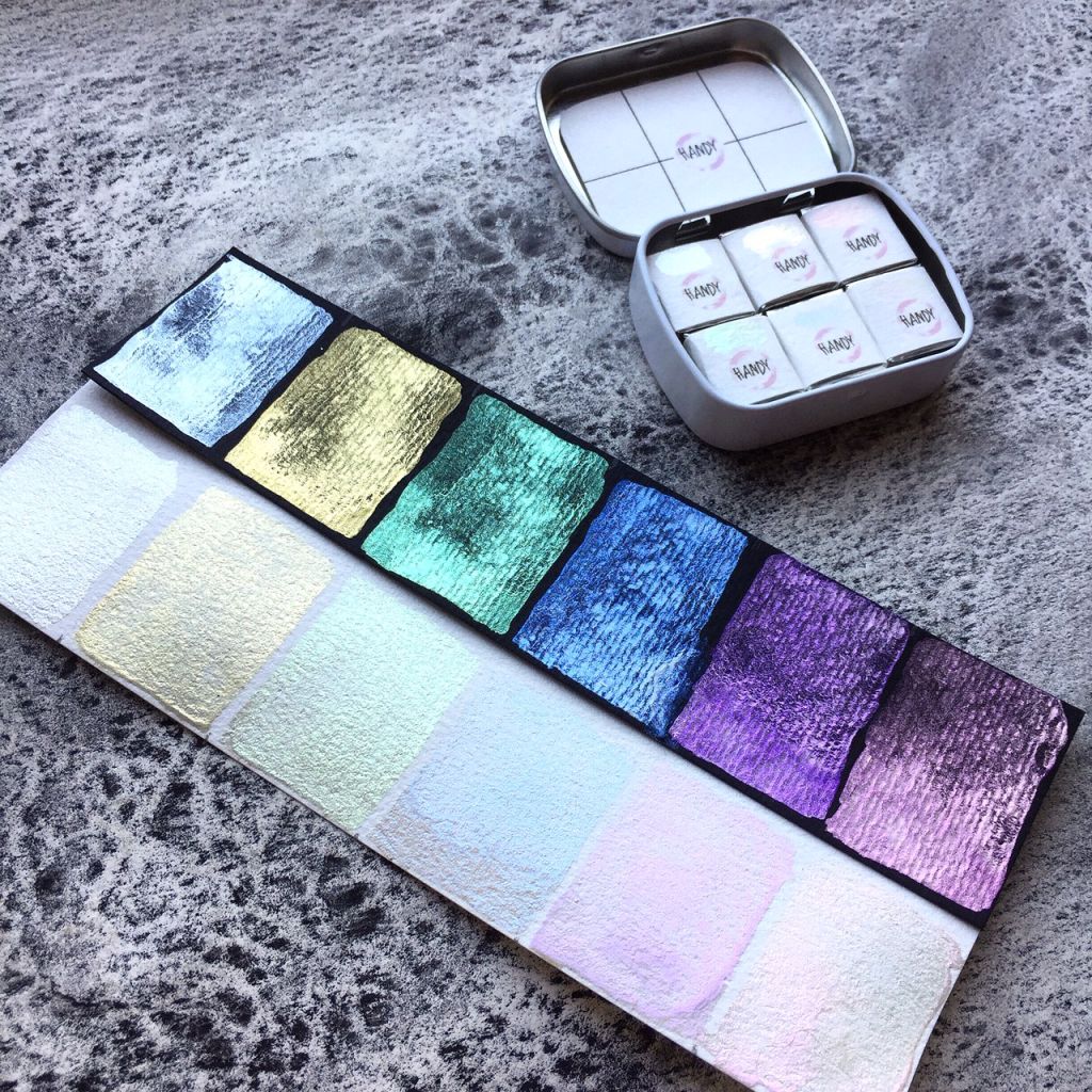 Handy watercolor – это художественный эксперимент по поиску новых цветовых решений в акварельной реальности. Автор проекта делает основной упор в палитре на необычные оттенки, в том числе с грануляцией, для создания спецэффектов и неповторимых фактур в акварельных иллюстрациях. Это краски, сделанные вручную в Петербурге из натуральных и синтетических пигментов со всего мира. Они не содержат каких-либо наполнителей, только чистые пигменты. В качестве связующего используется чистый гуммиарабик, глицерин, мед, антисептик и бычья желчь. Отлично подойдут как начинающим художникам, так и профессионалам. Встречайте набор интерферентных акварелек! Конечно переливаться разными оттенками они не будут, но все же это отличная альтернатива дорогим хамелеонам, которые к слову сказать, тоже есть в наличии поштучно. Этот набор отлично подойдёт для рисования жемчуга, мыльных пузырей и стекла на белом фоне, а вот на тёмном бэкграунде акцентирует внимание на важных мелочах в работе и для леттеринга тоже прекрасна.