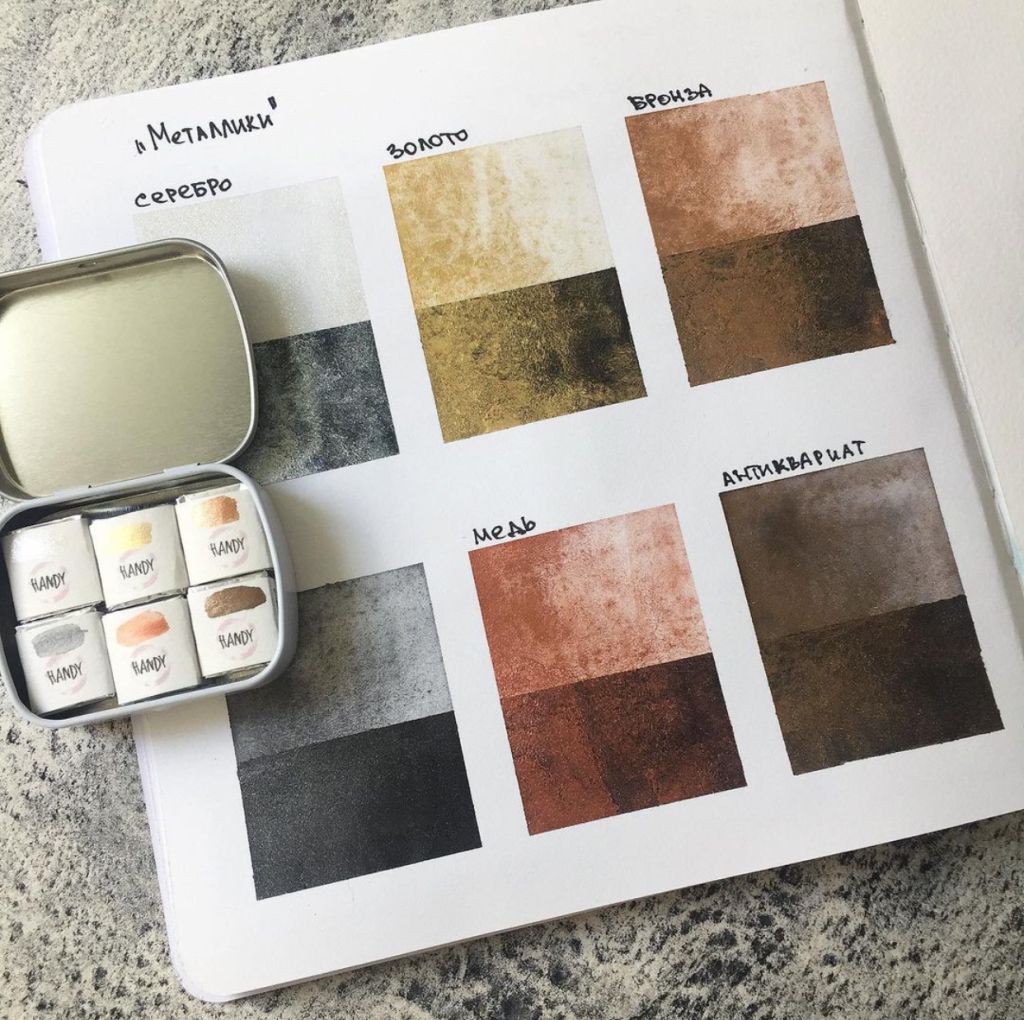Handy watercolor – это художественный эксперимент по поиску новых цветовых решений в акварельной реальности. Автор проекта делает основной упор в палитре на необычные оттенки, в том числе с грануляцией, для создания спецэффектов и неповторимых фактур в акварельных иллюстрациях. Это краски, сделанные вручную в Петербурге из натуральных и синтетических пигментов со всего мира. Они не содержат каких-либо наполнителей, только чистые пигменты. В качестве связующего используется чистый гуммиарабик, глицерин, мед, антисептик и бычья желчь. Отлично подойдут как начинающим художникам, так и профессионалам. В этом наборе собраны все классические цвета металлик.