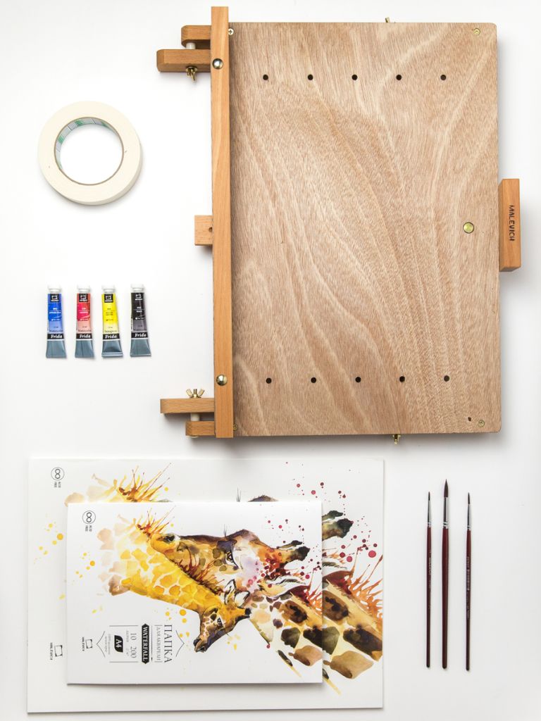 Набор подойдет любителям акварельной живописи. В составе удобный настольный мольберт с регулируемым углом наклона, который подходит для рисования на бумаге, кисти из синтетики для рисования акварелью, бумага для акварели формата А4 и А3 по 10 листов.