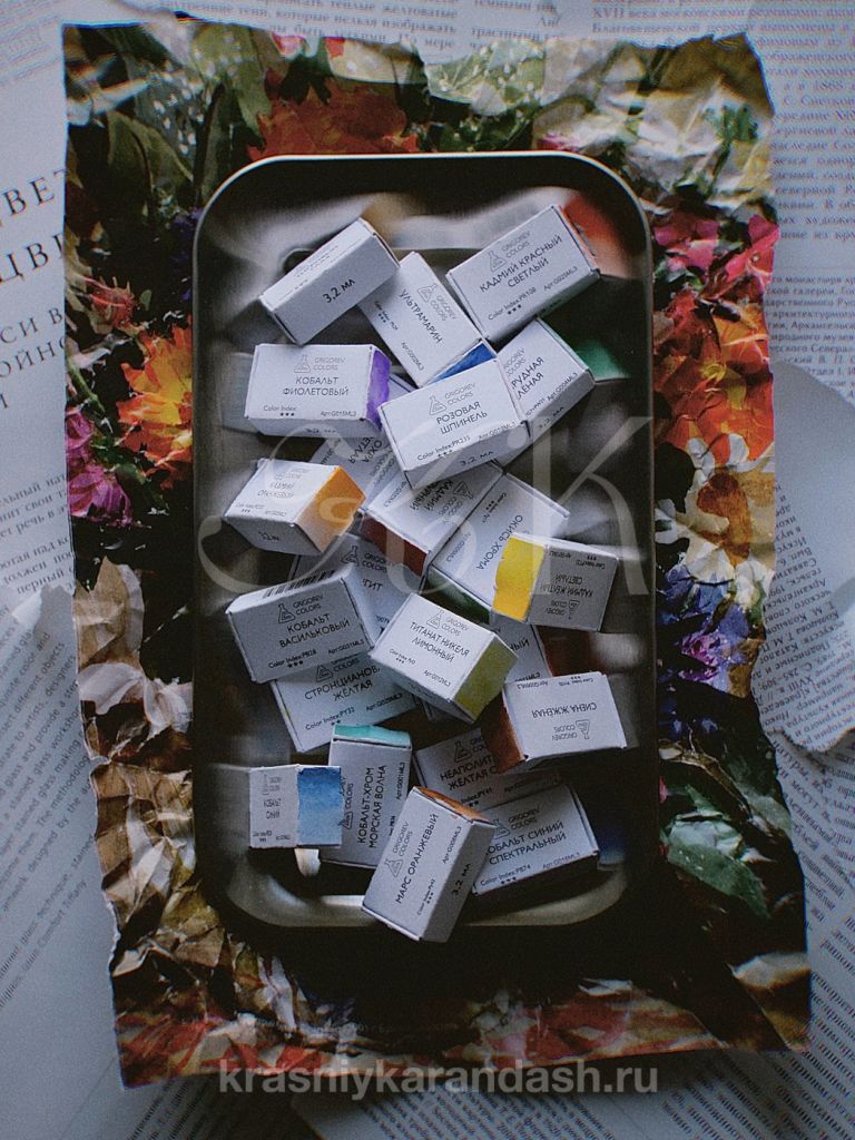 В составе акварели от "Минеральные пигменты" используются тонкорастёртые, концентрированные пигменты и гуммиарабик высокой очистки. Высокая степень перетира на керамической краскотерке даёт прозрачные, чистые и насыщенные цвета. Акварель прекрасно смешивается, легко размывается и имеет высокую светостойкость.