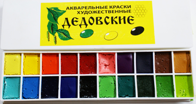 О «Дедовской акварели»: изготавливается из натуральных пигментов. Рецептура производства таких красок хранится в семье уже несколько поколений. В богатую цветовую палитру вошли краски холодных и теплых оттенков. По консистенции краска отдалённо напоминает гуашь, но с ярко выраженными акварельными свойствами. Выпускается в наборах по 20 и 40 цветов. Характеристика: большое разнообразие цветов от ярких до нежных пастельных оттенков. Хорошо ложится на бумагу.