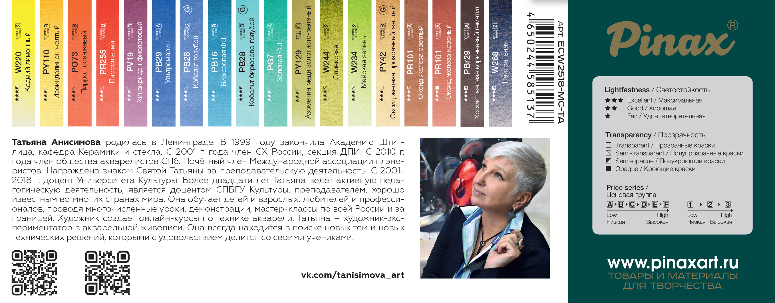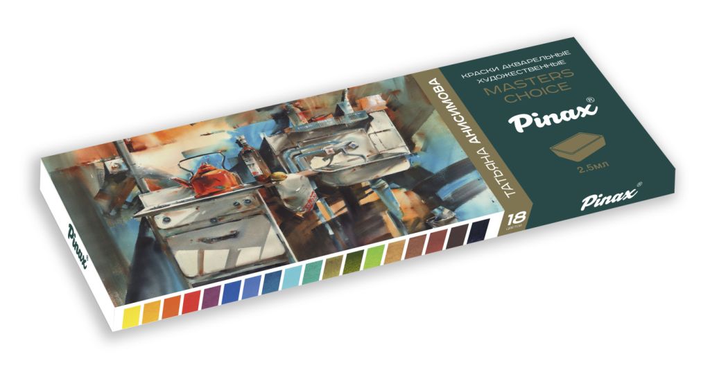 Профессиональная акварель Pinax EXTRA характеризуется применением лучших пигментов и натурального высококачественного гуммиарабика. Высокая степень перетира на краскотерках с керамическими валами, а также максимальная концентрация пигмента позволяют получать цвета с непревзойденной прозрачностью, чистотой и насыщенностью цвета. Краски прекрасно смешиваются и идеально подходят для всех акварельных техник. Только цвета, сделанные на основе пигментов с максимальной светостойкостью, могут войти в серию EXTRA. Авторский набор акварели Татьяны Анисимовой из 18 цветов подходит для разных задач, как в работе на пленэре, так и в студийной работе, например, для написания натюрмортов, где требуется более яркая палитра. Набор создан так, чтобы даже начинающий художник смог изобразить любую тему в акварели, но не запутаться в большом количестве пигментов. Очень универсален и прост для начинающих, подойдет в качестве базового набора акварели.