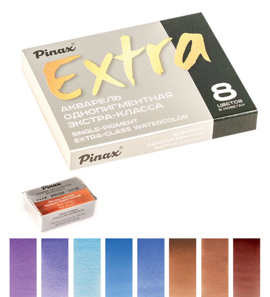 Профессиональная акварель Pinax EXTRA характеризуется применением лучших пигментов и натурального высококачественного гуммиарабика. Высокая степень перетира на краскотерках с керамическими валами, а также максимальная концентрация пигмента позволяют получать цвета с непревзойденной прозрачностью, чистотой и насыщенностью цвета. Краски прекрасно смешиваются и идеально подходят для всех акварельных техник. Только цвета, сделанные на основе пигментов с максимальной светостойкостью, могут войти в серию EXTRA. В этой линейке акварельных красок Pinax намерено решили отказаться от маркетинговых названий цветов, использовав взамен имя пигмента, сосредоточив фокус на том что действительно важно. Это нашло продолжение в дизайне этикетки – цветовой индекс пигмента расположен по центру этикетки. В наборе 8 гранулирующих цветов: Марганцевая фиолетовая; Ультрамарин фиолетовый; Церулеум светлый; Церулеум; Кобальт голубой; Оксид железа красно-коричневый; Оксид железа светлый; Кадмий пурпурно-красный.