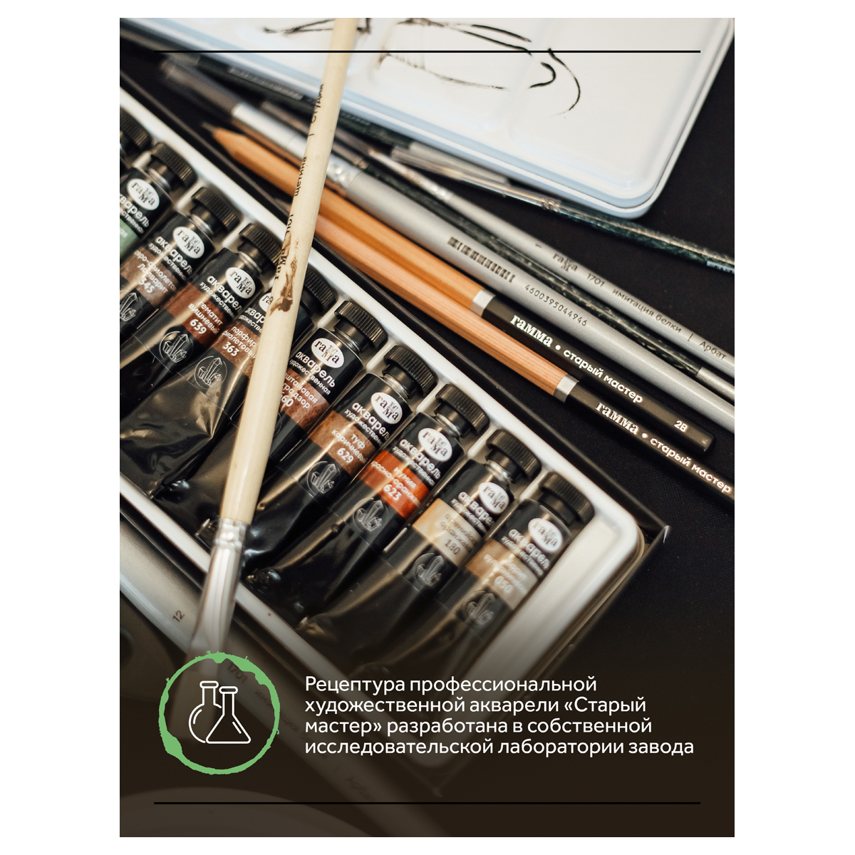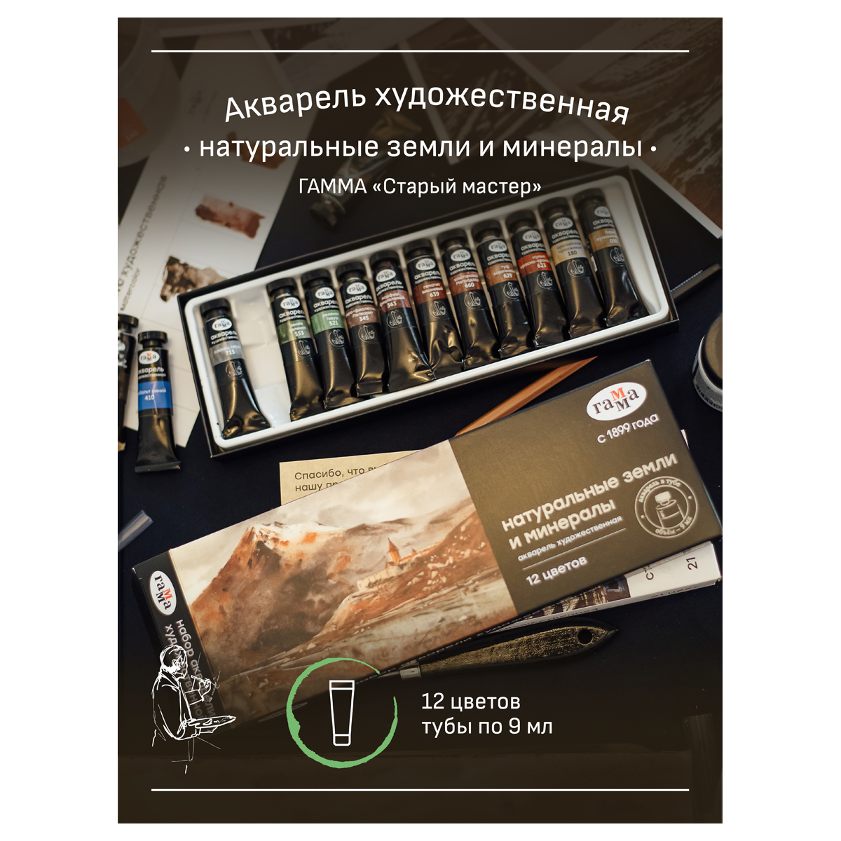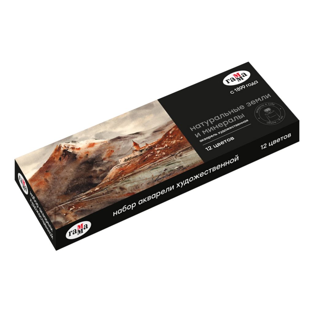 Набор профессиональной художественной акварели «ГАММА» серии «Старый мастер» состоит из 12 цветов. Объём одной тубы – 9 мл. В наборе собраны 12 уникальных цветов, изготовленных из натуральных и земляных пигментов. Рецептура профессиональной художественной акварели «Старый мастер» разработана в собственной исследовательской лаборатории завода. Набор упакован в картонную коробку.