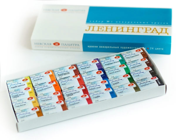 Набор художественной акварели ЛЕНИНГРАД-1 состоит из 24 индивидуальных кювет разных цветов, объем каждой - 2,5мл. Акварель изготовлена из тщательным образом растертых мономолекулярных цветовых пигментов и растительного клея гуммиарабика. Акварель легко ложится на бумагу, легко разносится, а также имеет высокую светостойкость и практически не теряет свой вид со временем. Краски предназначены для художественных работ на бумаге, картоне. Это одна из самых популярных серий отечественных красок, рекомендуемых для учащихся художественных школ и училищ. Набор ЛЕНИНГРАД-1 состоит из акварельных красок БЕЛЫЕ НОЧИ.