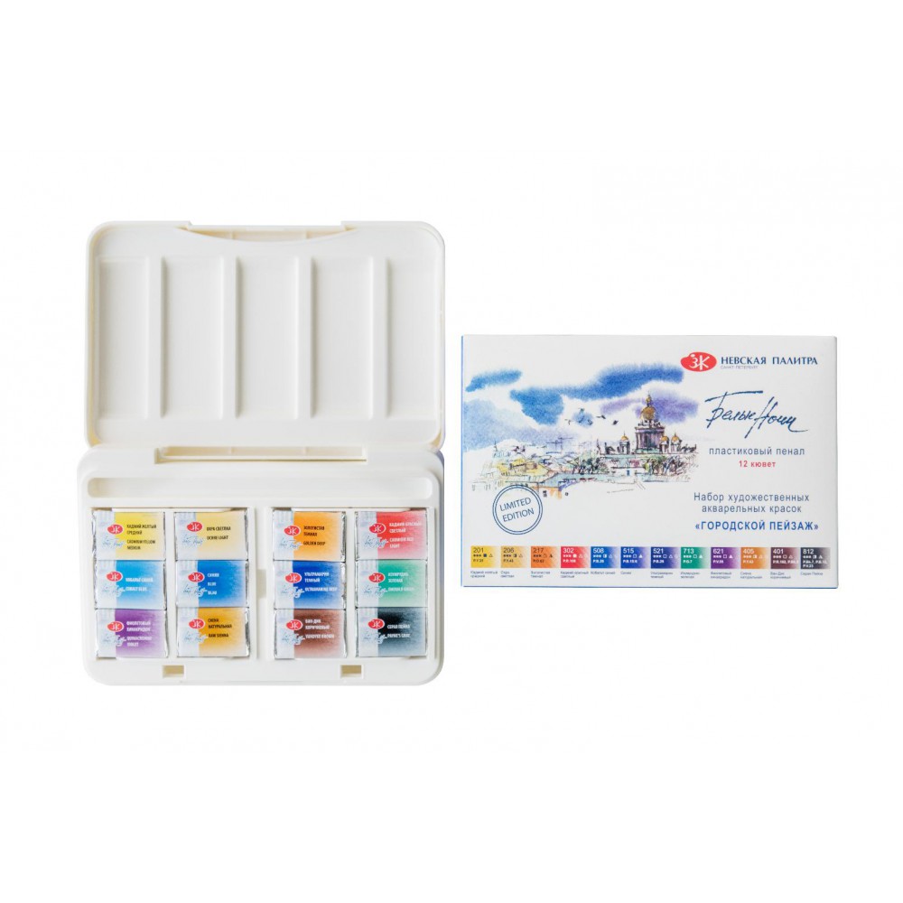Акварель «Белые ночи» — краски, выпускаемые в полусухом виде в кюветах по 1,6 миллилитров и в тубах по 10 мл. Акварель «Белые ночи» изготовлена из высококачественных тонко тертых пигментов и связующего с добавлением гуммиарабика. Цвета хорошо смешиваются между собой и легко размываются водой. Краска обладает высокой светостойкостью. Акварелью в кюветах можно заменить закончившиеся краски из набора, что очень удобно. Все акварельные краски в палитре «Белые ночи» безопасны, сертифицированы и соответствуют стандартам ASTM D-4236. Высокая концентрация пигмента обеспечивают максимальную интенсивность цветового тона акварели. Насыщенность сохраняется даже при разбавлении большим количеством воды. Отличаются прозрачностью, что дает возможность художнику работать тонкими лессировками. Чистые цвета позволяют писать в смесях и получать богатое многообразие оттенков. Основная часть красок обладает высочайшим показателем светостойкости, что способствует сохранности работ свыше 100 лет. Все это обеспечивает их высокое качество и возможность использования в ответственных работах. Тематический набор профессиональной акварели «Городской пейзаж» разработан для создания пейзажей городской среды и архитектурных скетчей. Акварель «Белые ночи» производится заводом художественных красок Невская палитра, расположенным в городе Санкт-Петербурге. Завод уже более 80 лет выпускает продукцию для профессиональных художников и любителей творчества.