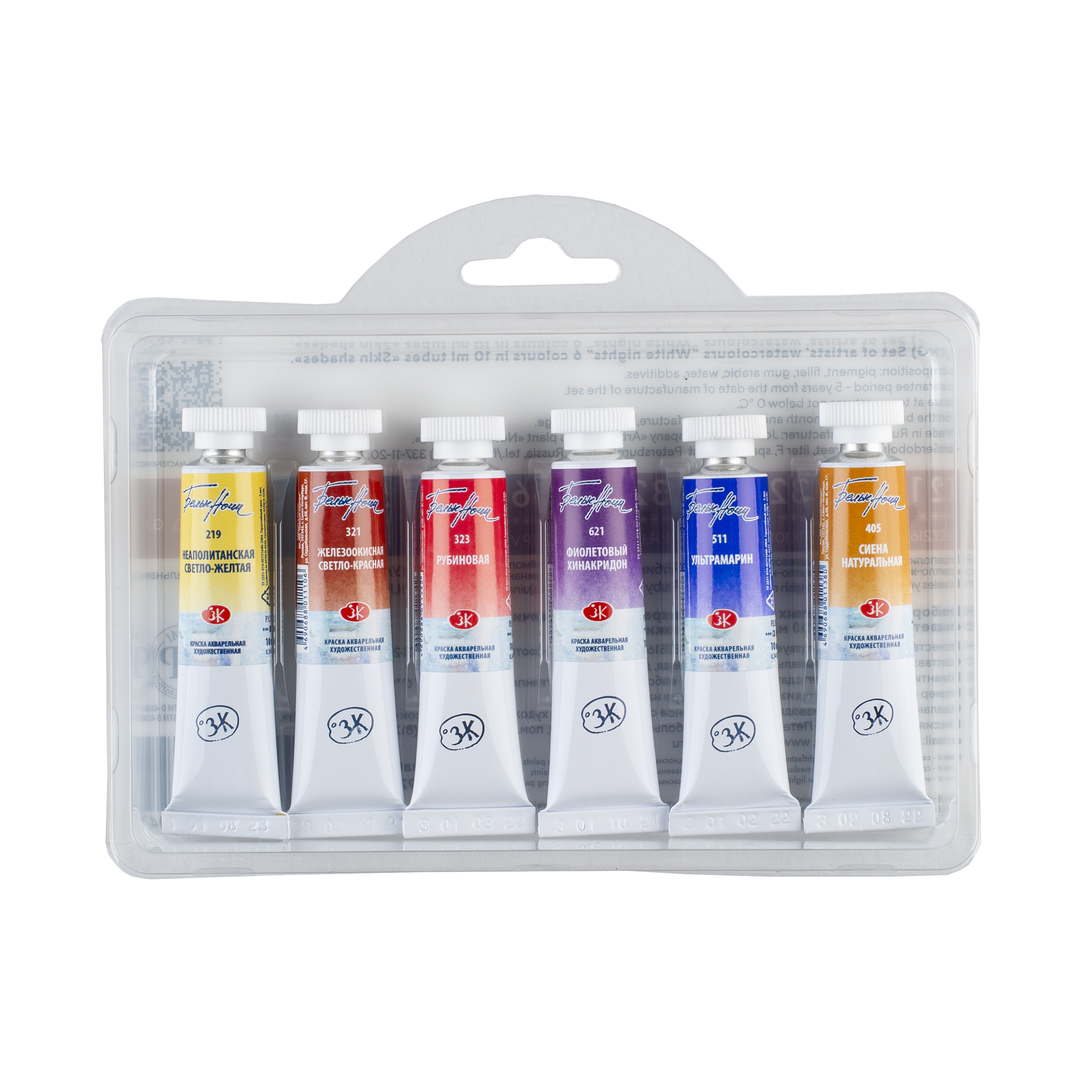 Акварель «Белые ночи» — визитная карточка завода «Невская палитра», эти краски признаны профессиональными художниками и считаются одними из лучших среди отечественных акварелей. Художественные акварельные краски «Белые ночи» изготавливаются из тонкотертых пигментов и связующего из натурального гуммиарабика, признанного лучшим растительным клеем для приготовления художественных водных красок. Максимальная интенсивность цветового тона акварели, сохраняющаяся даже при разбавлении большим количеством воды, достигается благодаря высокой концентрации пигмента и тонкости его перетира. Такие свойства, как яркость и чистота цвета, высокая светостойкость, прекрасная разносимость и прозрачность сделали акварель ЗХК любимыми красками нескольких поколений живописцев. В наборе 6 туб по 10 мл. в сбалансированной цветовой палитре: неаполитанская светло-жёлтая, железоокисная светло-красная, рубиновая, фиолетовый хинакридон, ультрамарин, сиена натуральная.